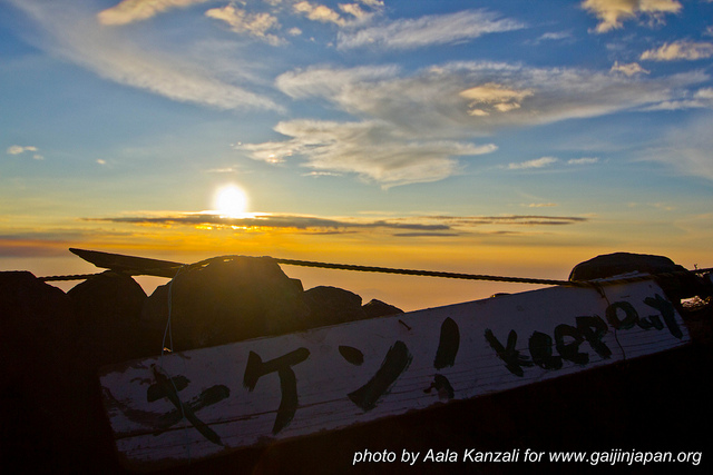 L’ascension de nuit est clairement la plus prisée car elle permet d’arriver au sommet et ainsi de profiter du lever de soleil et de tout le cérémonial mis en place par les responsables sur place. Ainsi, dès les premiers rayons de soleil vous entendrez l’hymne national japonais et vous pourrez voir le drapeau du Japon prendre de la hauteur, le tout accompagné par des cris de joies retenus des japonais présent sur place. C’est tout un symbole qui prendra place autour de vous et qui vous emportera dans tout ce cérémonial. Une expérience unique à vivre au moins une fois, pour voir ce que ça fait. Le seul véritable point noir de ce moment est la foule conséquente, qui prend de la place et ralenti fortement la montée vers le sommet.