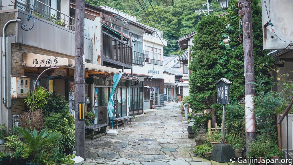 Il n’est pas grand, il ne paye pas de mine, il est un peu vieillot (ses bâtiments), on a un peu l’impression d’être dans un Japon post seconde guerre mondiale et de se dire que c’est un peu irréel, surtout le soir. Oui, le soir, c’est la magie qui opère sur place. Les lanternes oranges – jaunes s’éclairent sur les bâtiments d’un autre temps, dans des rues où seul un véhicule à la fois peut passer (quand il en passe) et où le silence règne. Il n’y a pas de Konbini ouvert 24H/24, il n’y a presque personne dans les rues, sauf quelques locaux qui vont dans les Onsen publics et moi qui prend des photos.