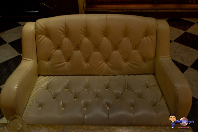 Au second regard, on se rend vite compte que les meubles sont très usés. Les fauteuils originellement beige – crème commencent à se déchirer et ont une légère teinte noire – bleue, comme si des vêtements avaient déteints dessus. Mais qu’importe, il fat profiter de l’ambiance calme du lieu.
