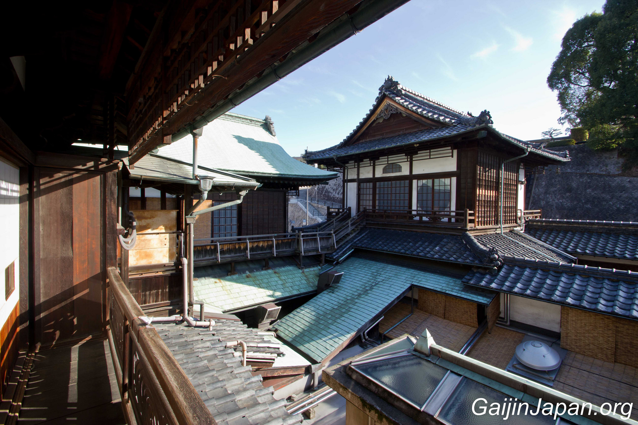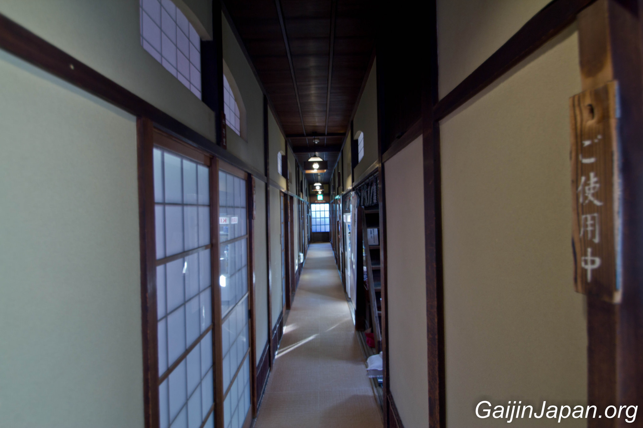 Une fois à l’intérieur du bâtiment on se rend vite compte qu’il s’agit là d’un véritable labyrinthe où l’on pourrait se perdre en explorant, montant et descendant les divers escaliers étriqués tout en bois, et en marchant sur les tatamis. Le rez-de-chaussée est là où se trouvent l’accueil et le bain le plus « populaire » tandis que le deuxième étage accueille la salle de repos commune et le second bain, et enfin le troisième étage accueille les salles de repos privatives et une salle dédiée à Botchan et son auteur. L’annexe Yushinden est elle accessible, pour les détenteurs d’un ticket, depuis le deuxième étage, à condition d’être accompagné par un guide.