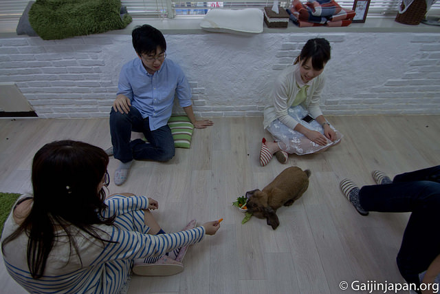 Le droit d’entrée est relativement bas puisqu’il est de 500 Yens, auxquels ont ajoute les consommations (quelques centaines de Yens) et 150 Yens si on veut acheter de la nourriture pour les lapins. On peut soit se relaxer et admirer les lapins, soit décider d’enlever ses chaussures et de jouer avec eux dans un espace dédié.