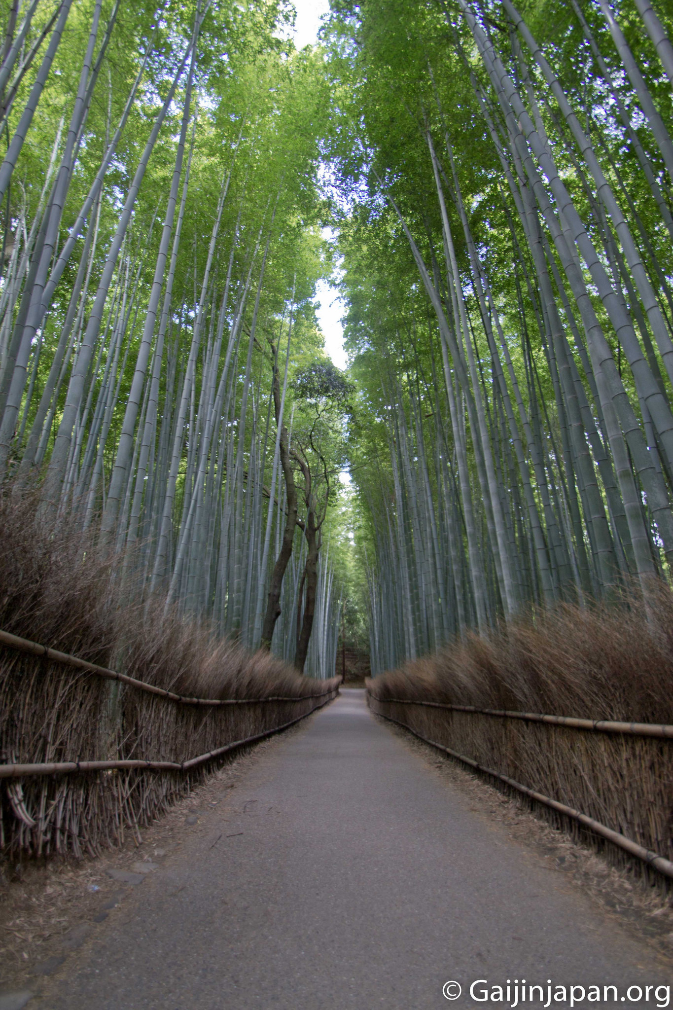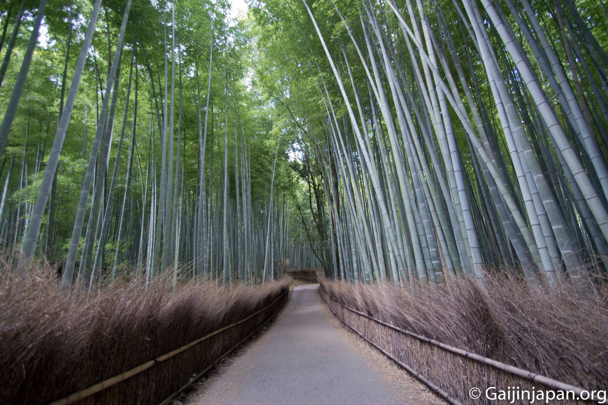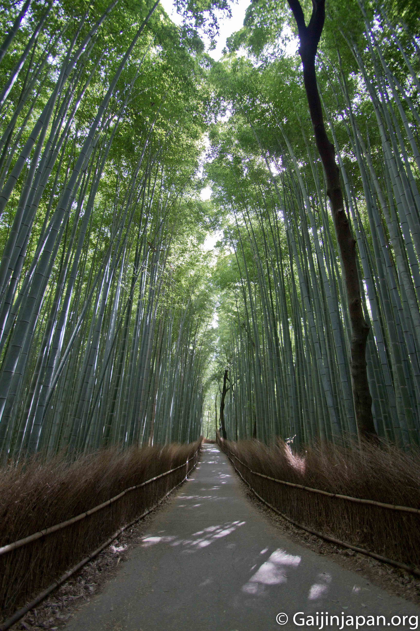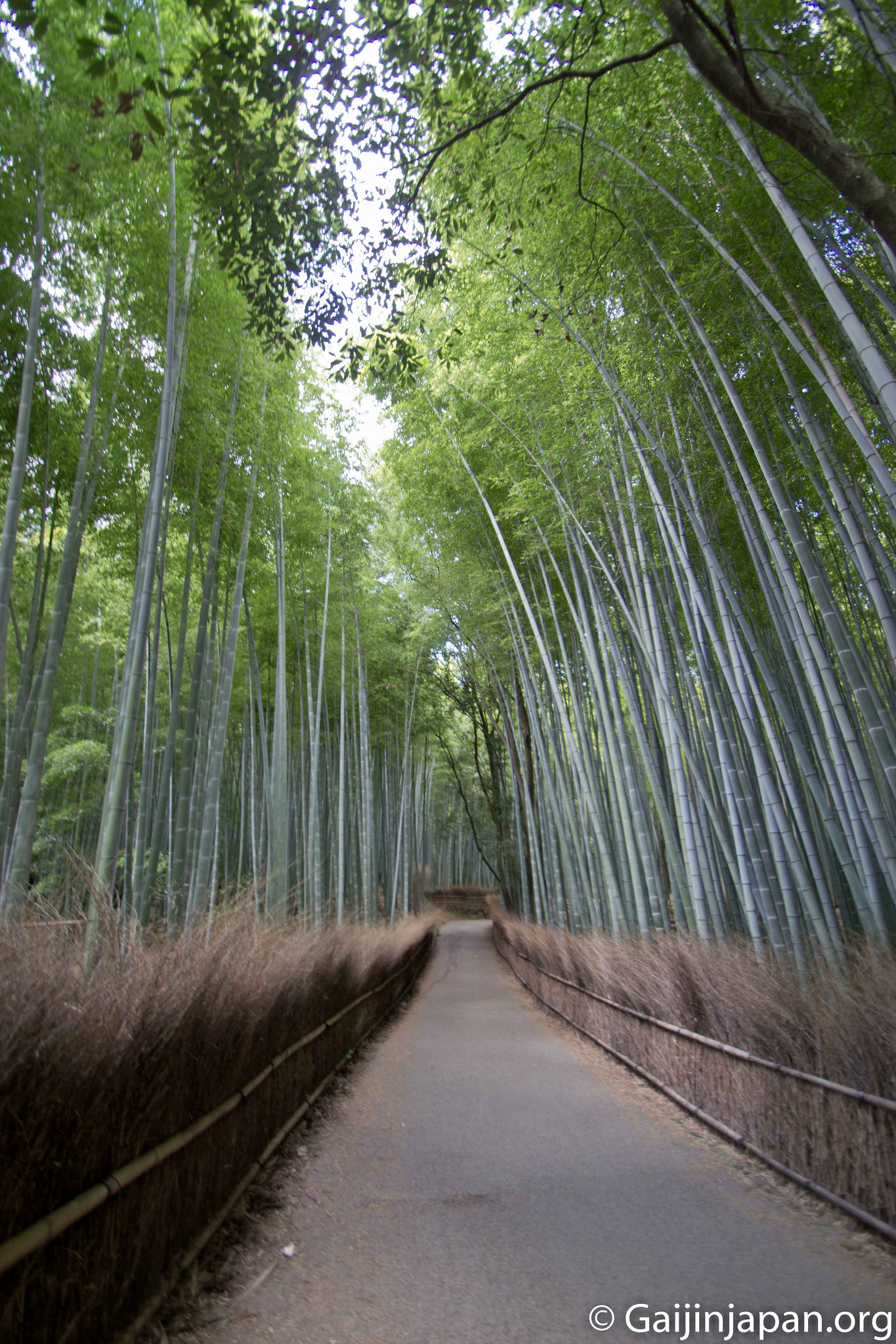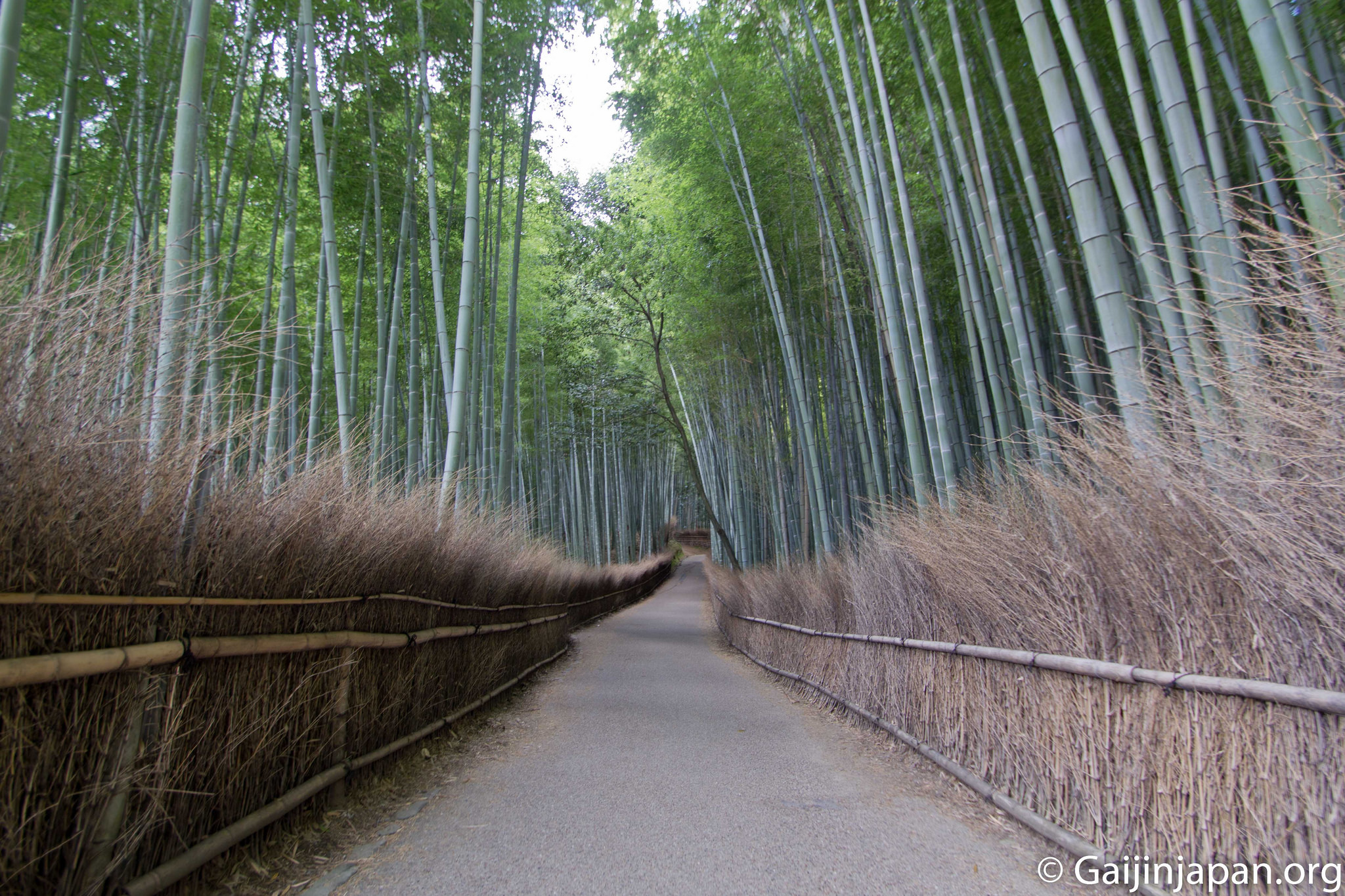 Sur plus de 500 mètres, contrairement à ce qui peut parfois être annoncé sur le Net par certaines personnes affirmant qu’elle se limite à un passage d’une cinquante de mètres, se trouve une véritable forêt de bambous d’une taille gigantesque (ils atteignent facilement plusieurs dizaines de mètres de haut). Il s’agit là de la bambouseraie d’Arashiyama, qui passe à proximité du temple Tenryu-ji, au niveau de l’entrée Nord de ce dernier, de la villa Okochi Sanso ainsi que du sanctuaire Nonomiya.