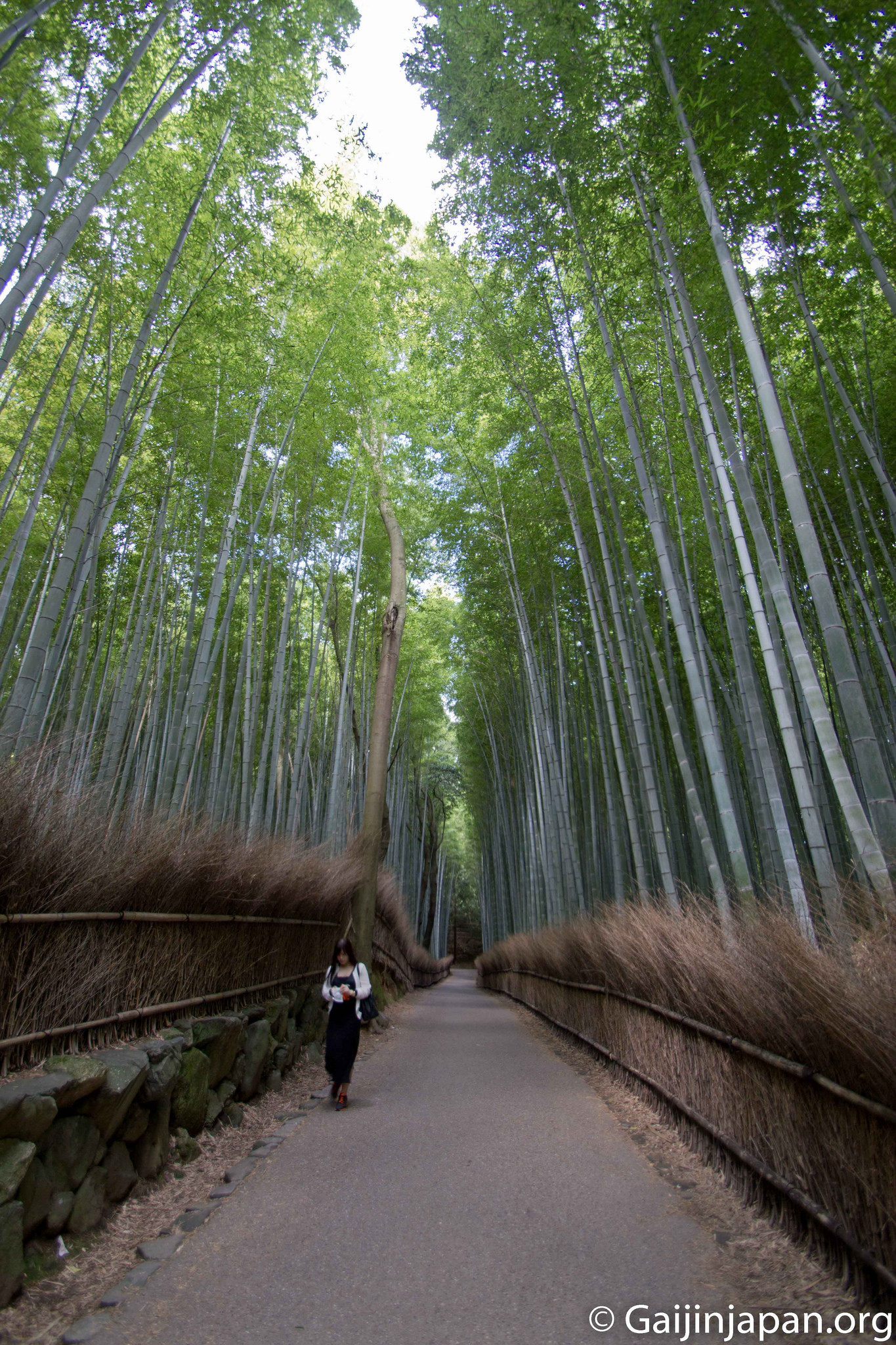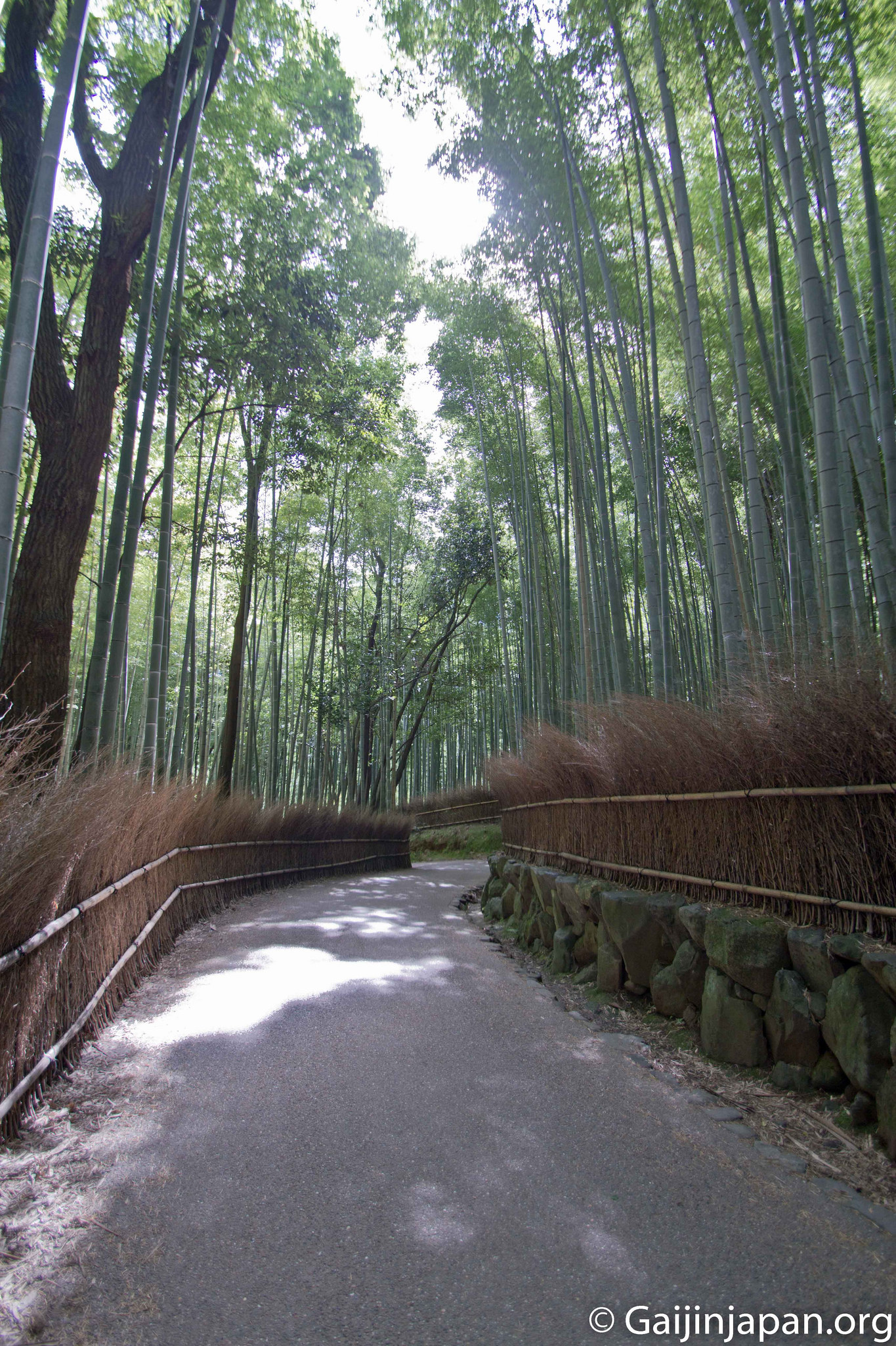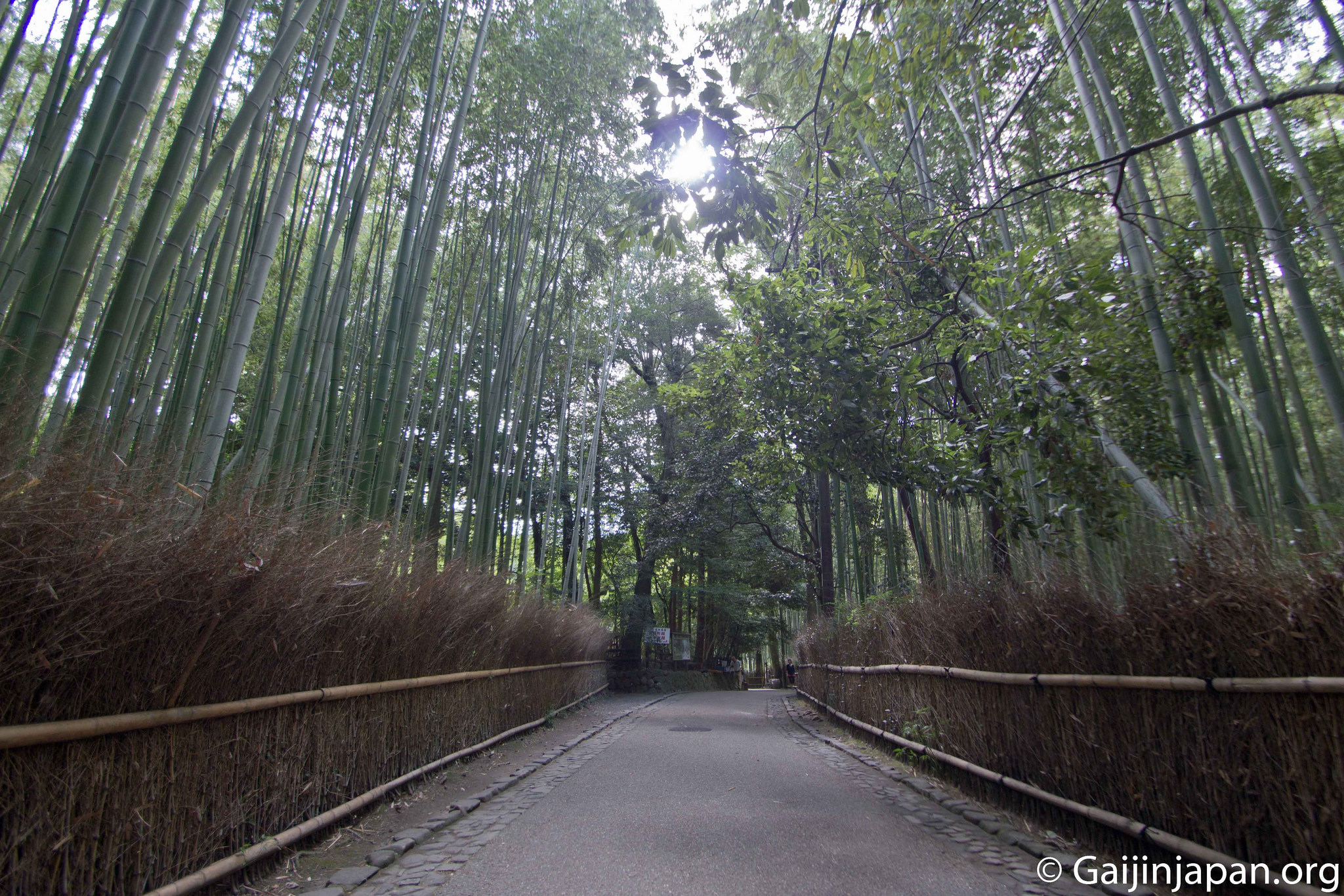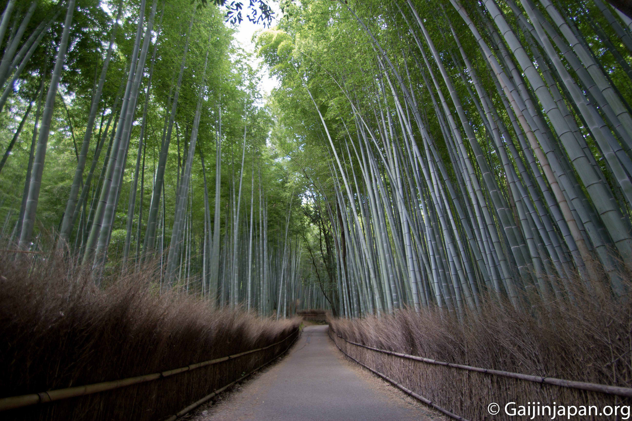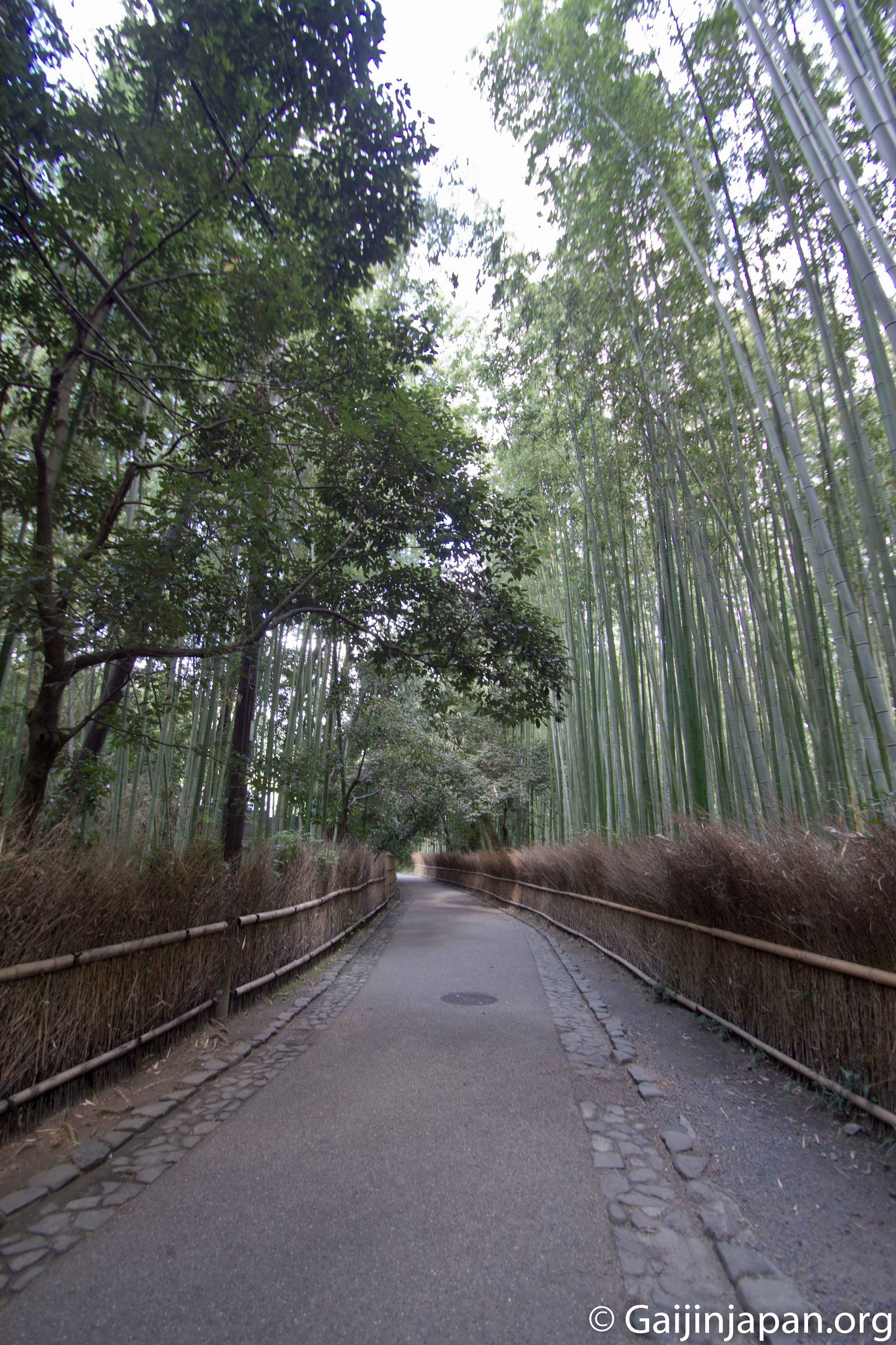 Sur plus de 500 mètres, contrairement à ce qui peut parfois être annoncé sur le Net par certaines personnes affirmant qu’elle se limite à un passage d’une cinquante de mètres, se trouve une véritable forêt de bambous d’une taille gigantesque (ils atteignent facilement plusieurs dizaines de mètres de haut). Il s’agit là de la bambouseraie d’Arashiyama, qui passe à proximité du temple Tenryu-ji, au niveau de l’entrée Nord de ce dernier, de la villa Okochi Sanso ainsi que du sanctuaire Nonomiya.