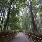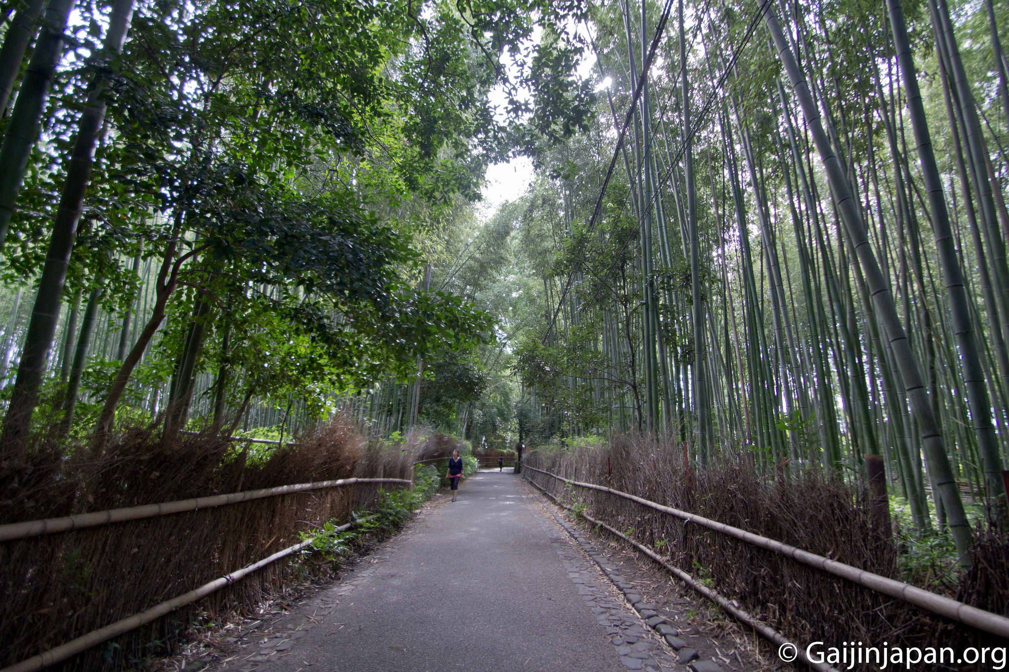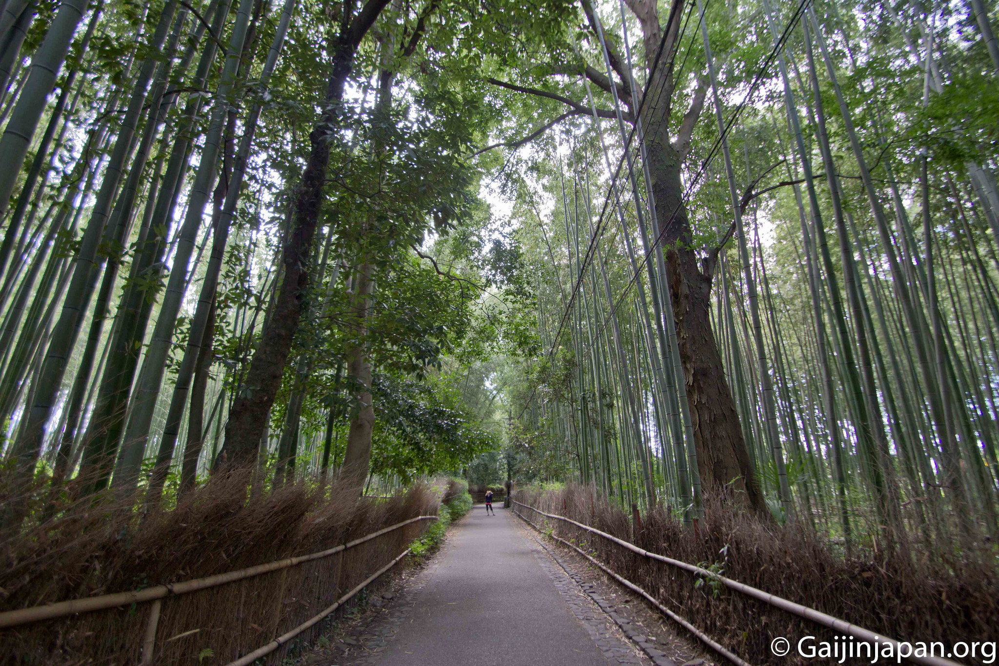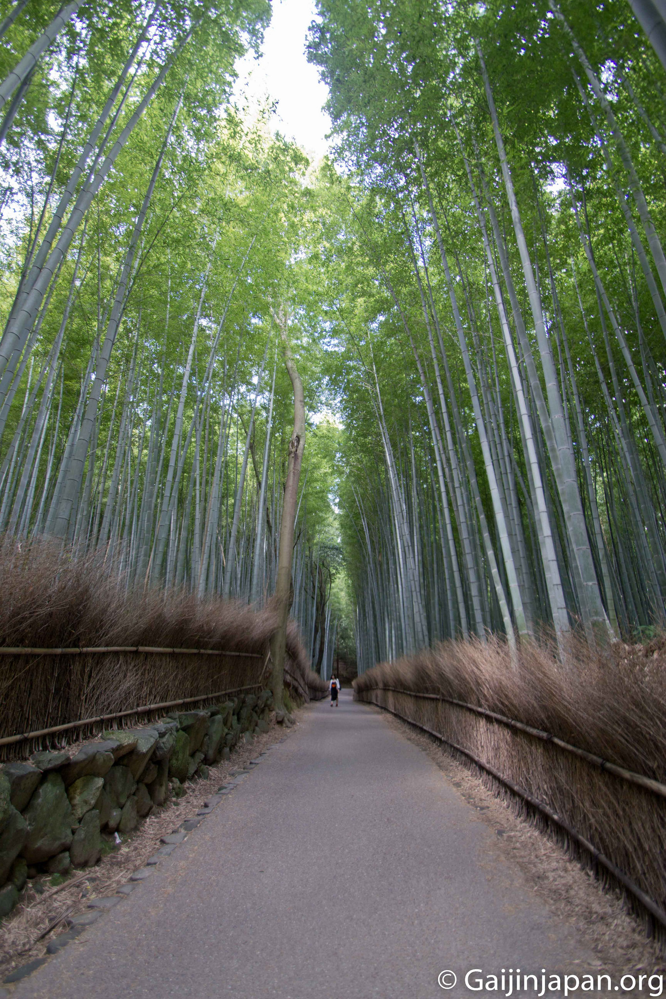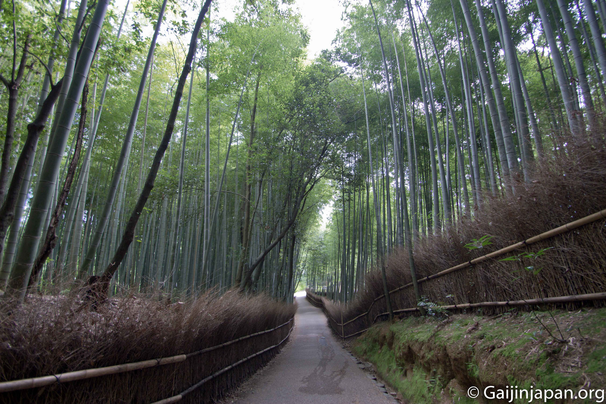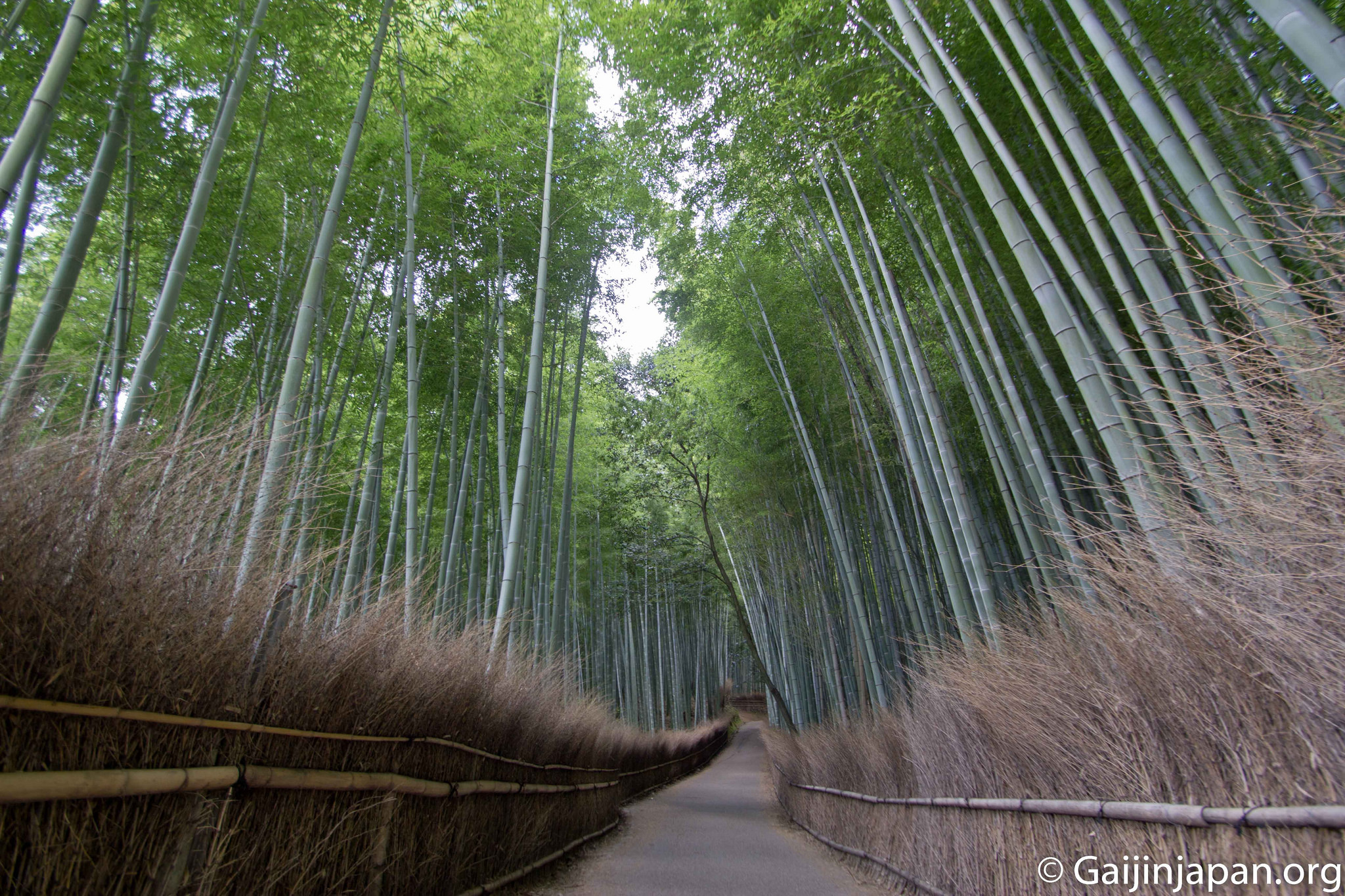Sur plus de 500 mètres, contrairement à ce qui peut parfois être annoncé sur le Net par certaines personnes affirmant qu’elle se limite à un passage d’une cinquante de mètres, se trouve une véritable forêt de bambous d’une taille gigantesque (ils atteignent facilement plusieurs dizaines de mètres de haut). Il s’agit là de la bambouseraie d’Arashiyama, qui passe à proximité du temple Tenryu-ji, au niveau de l’entrée Nord de ce dernier, de la villa Okochi Sanso ainsi que du sanctuaire Nonomiya.