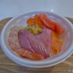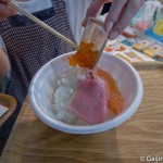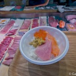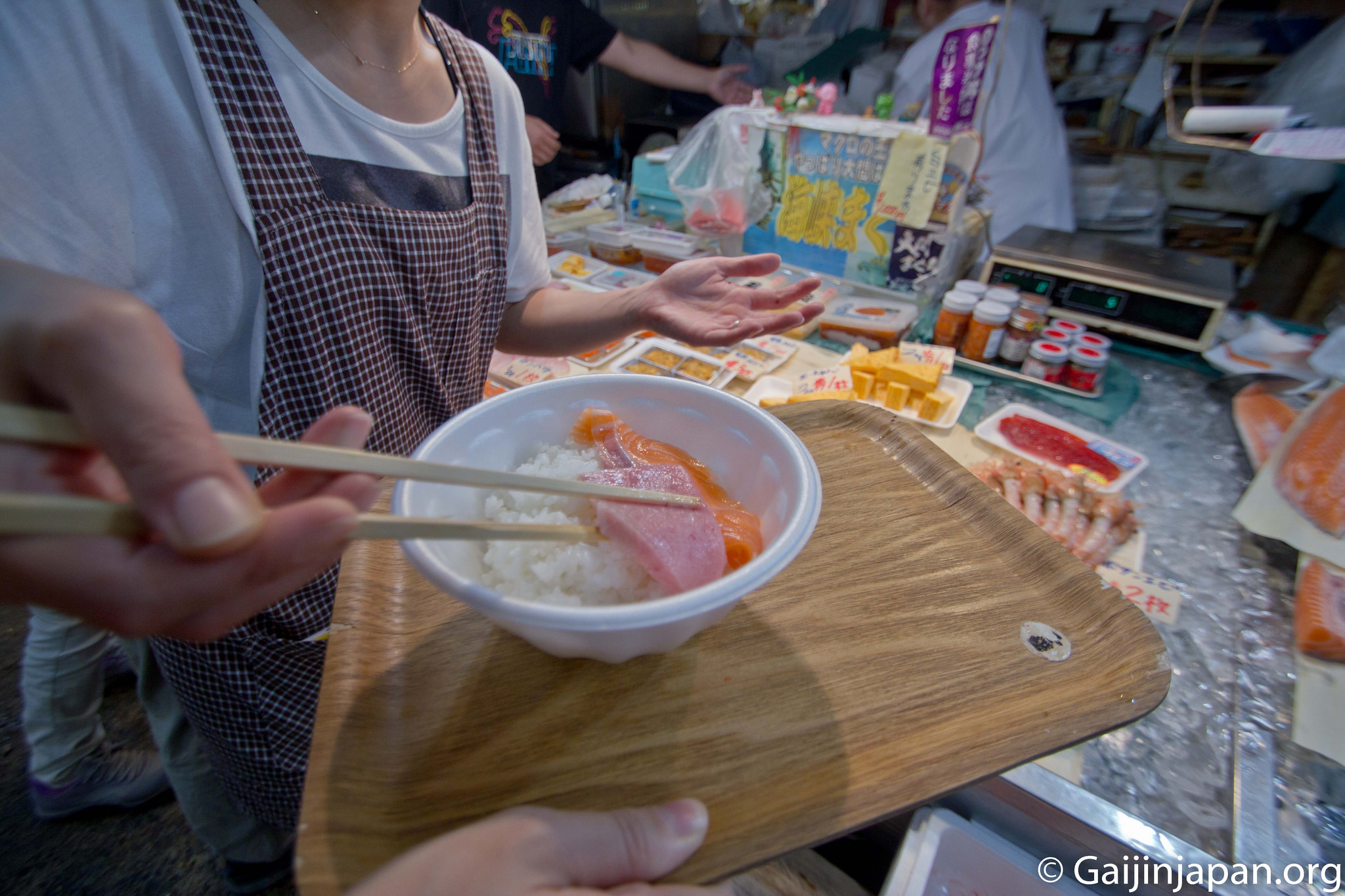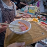– Une fois le bol de riz en votre possession c’est là que commence la meilleure partie. Vous allez vous balader de poissonniers en poissonniers (identifiés avec un drapeau bleu) et échanger vos tickets restant contre des portions de poissons dont le tarif varie entre 1 et 3 tickets. Vous allez ainsi composer une garniture des plus personnalisée.