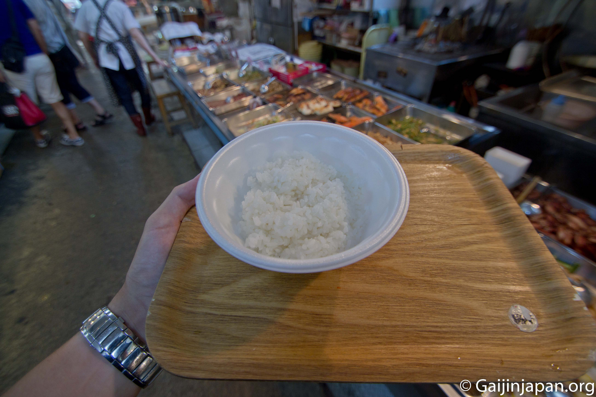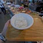 – Une fois les tickets en votre possession, regardez le plan du marché, trouvez un stand où sont vendus les bol de riz (identifiés avec un drapeau orange) et acheter votre bol de riz sur place (1 ticket = portion normale / 2 tickets = grande portion).