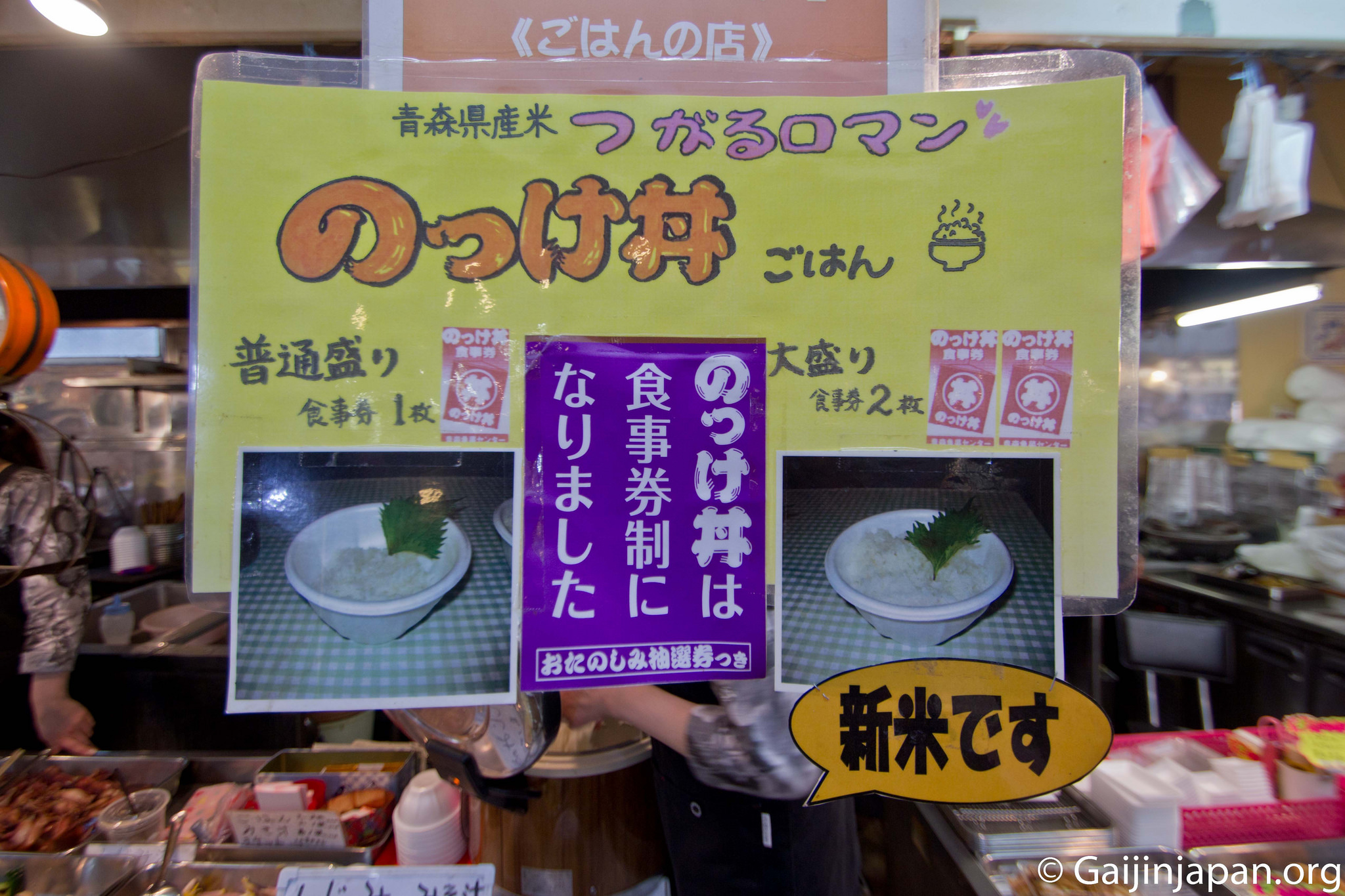 Le Donburi est une spécialité japonaise qui consiste en un bol de riz sur lequel est déposé des garnitures diverses et variées. On en trouve sous toutes ses formes et même au Fukugawa Ichiba à Aomori. Sauf qu’ici, ils sont particuliers. Ils sont appelés Nokkedon et consistent en des Donburi personnalisables. Ainsi, vous pouvez décider de chaque pièce de garniture que vous voulez disposer sur votre bol de riz en les achetant auprès de chaque poissonnier, une par une.