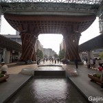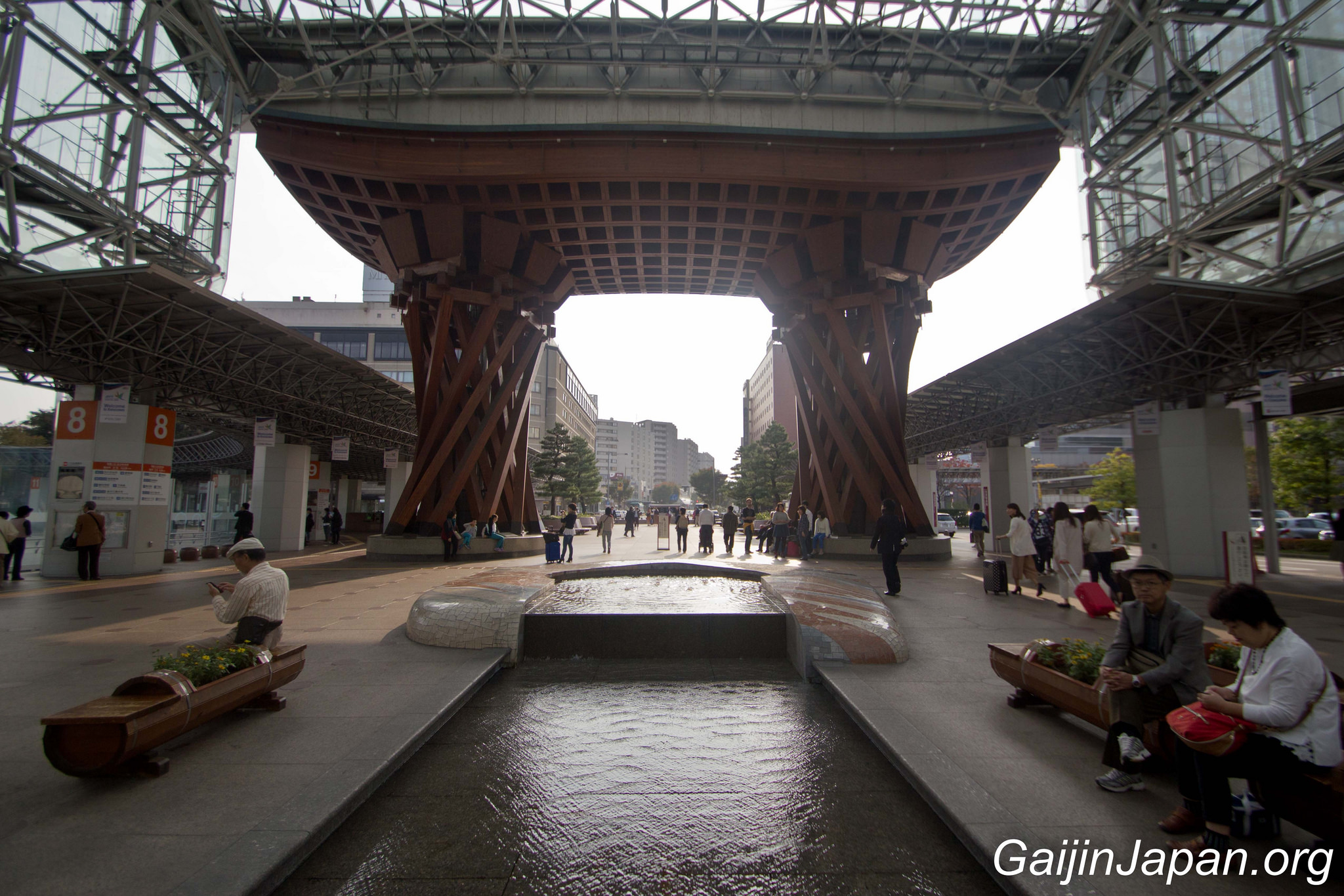 - Tsuzumi-mon (鼓門) : habituellement, on voit des Torii à l’entrée des sanctuaires au Japon. Il peut être ainsi surprenant de voir l’un d’entre eux à l’entrée d’une gare. Et pourtant, celui de la station de Kanazawa a de particulier, outre sa date de construction récente et le fait qu’il ait été construit de manière traditionnelle et entièrement en bois, le fait qu’il ait prit la forme d’un instrument japonais, une sorte de tambour, appelé Tsuzumi.