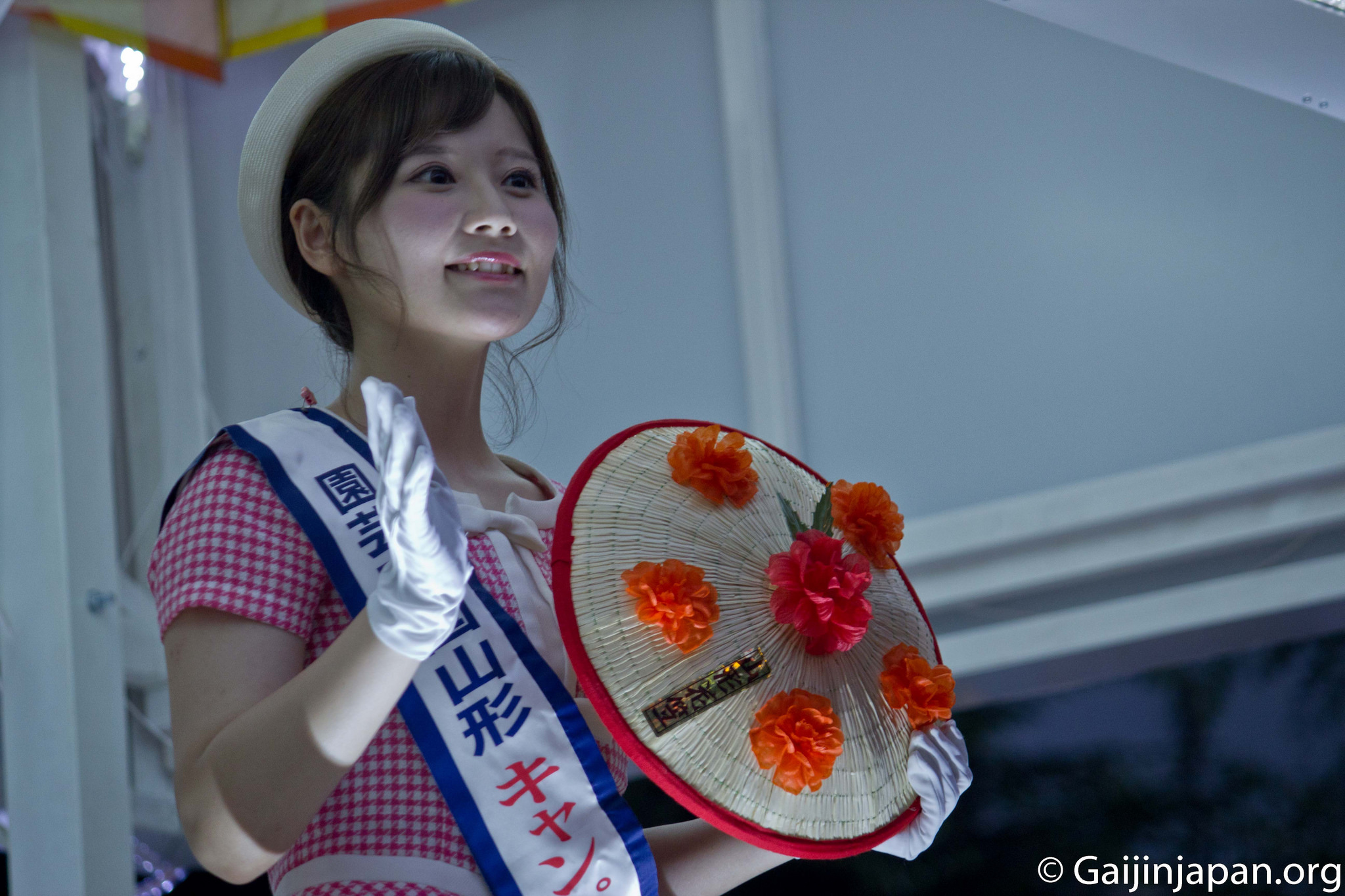 Ce chapeau est l’un des emblèmes de la Hanagasa Odori (花笠踊り). Il est fait de paille et orné de fleurs en papier rouge, les carthames, symbole de la préfecture de Yamagata. Vous ne pourrez pas les rater puisqu’ils sont un élément important de la danse et qu’ils sont exhibés fièrement par tous durant la parade.