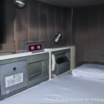 Concrètement, il s’agit de rangées de deux capsules de haut, à en perdre le compte, et qui fait penser à un décor futuriste (ou une morgue pour les plus glauques). La capsule est l’espace privé du client, et elle est plutôt confortable, avec un matelas, un coussin, une couverture, une télé, une prise électrique et un réveil.