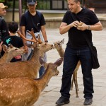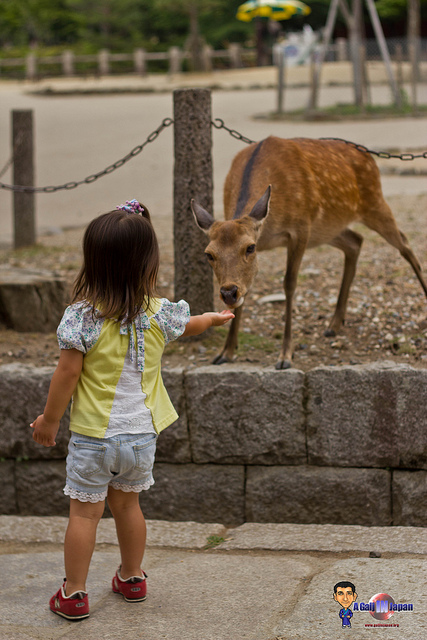 Je passe ainsi pas moins de 30 minutes à acheter des biscuits et à nourrir mes nouveaux amis. Ils sont toujours assez mignons, me font des gestes de la tête pour me réclamer de la nourriture et pendant ce temps je parle avec eux en français et en japonais. Mais je me demande bien s’ils m’ont vraiment compris. Certains d’entre eux me mettent quelques gentils coups de cornes et d’autres m’attrapent, avec leur bouche, par le polo afin que je les nourrisse. Ils savent vraiment s’y prendre au final pour avoir tout ce que vous avez dans la main.