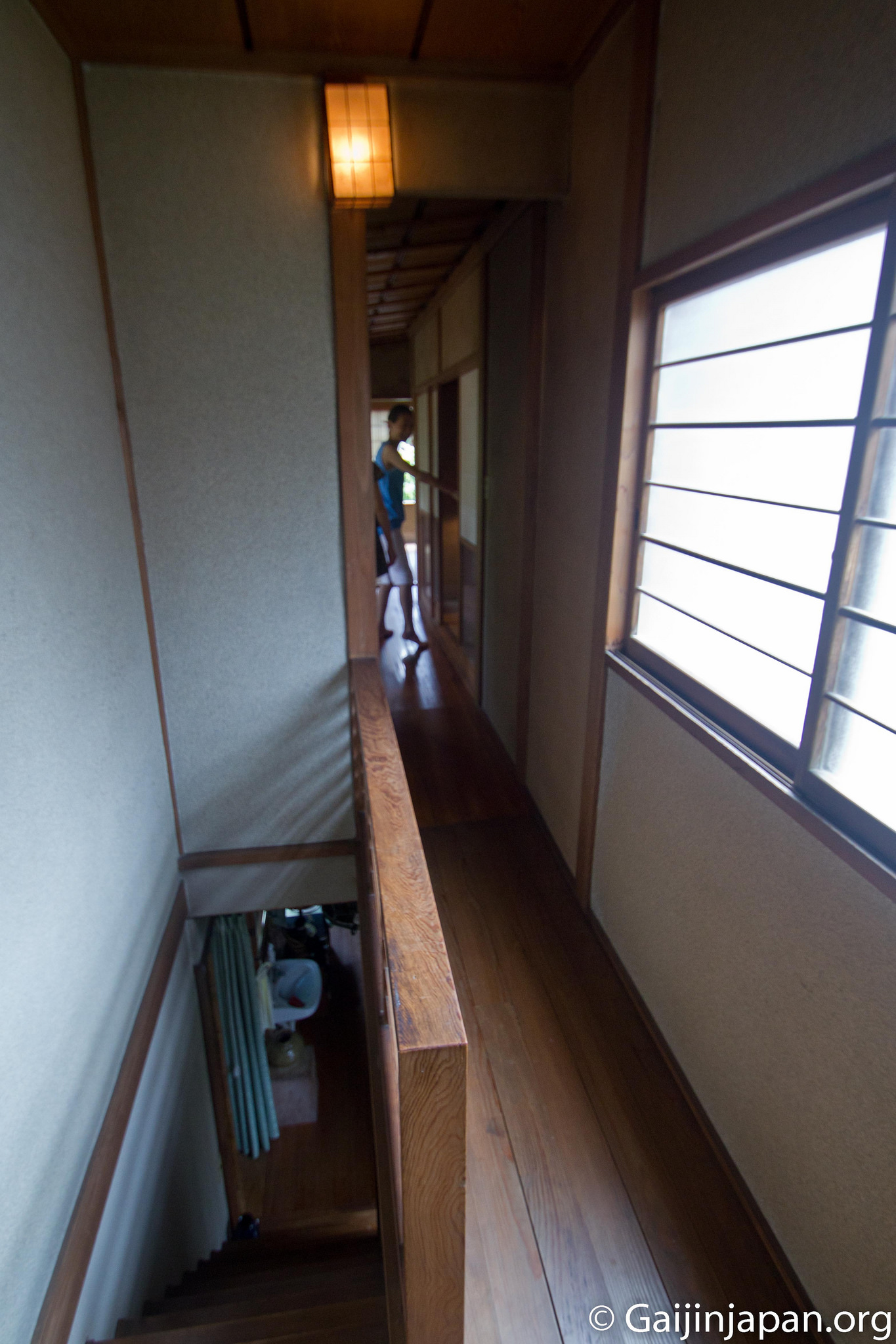 Un escalier en bois sur la gauche nous emmène au niveau des deux premières pièces de la maison, là où les invités étaient reçus par les Geisha ou la maitresse de maison. Une fois ces deux pièces visitées, on continue par un petit couloir offrant une vue sur le jardin verdoyant jusque dans la pièce où les Geisha se préparaient et s’habillaient. Juste à côté se trouve une autre pièce, réservée à leur quiétude, avec une terrasse utilisée pour faire sécher le linge.