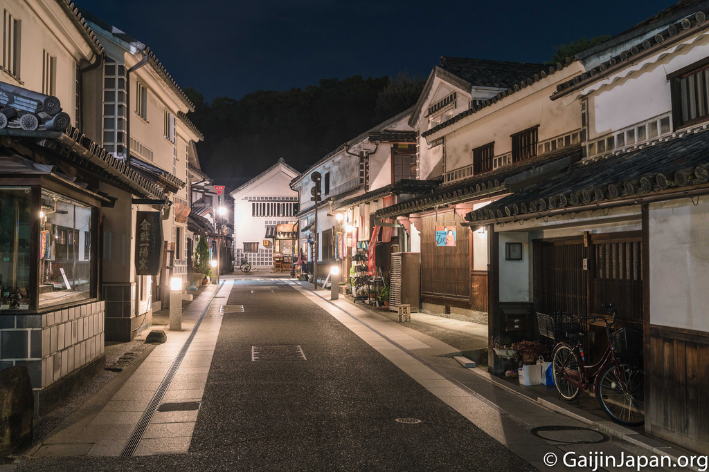 • Promenade nocturne dans les rues du quartier : le jour, le quartier central est pris d’assaut par tous les touristes et autres curieux. Mais, une fois le soir venu, c’est le calme plat, qui permet de profiter plus tranquillement du cadre d’époque. Je vous recommande dormir à Kurashiki pour bien en profiter.