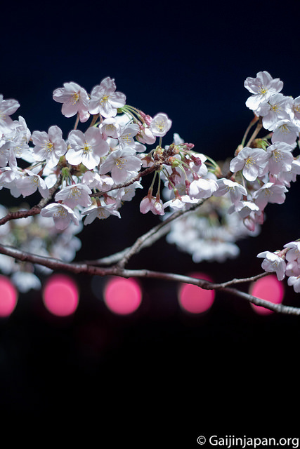 Pendant une semaine et demi, environ, au début du printemps, tous les soirs, à la nuit tombée, des lampions blanc et rouge vont s’éclairer pour offrir un spectacle magnifique autour des cerisiers en fleurs, à tous ceux qui se trouvent dans les environs. Ainsi, jusqu’à 21H00 environ, ces lanternes de papiers brilleront de milles feux et feront resplendir les Sakura comme par magie, autour d’une eau qui réfléchira les éclats roses / rouges de ce spectacle.