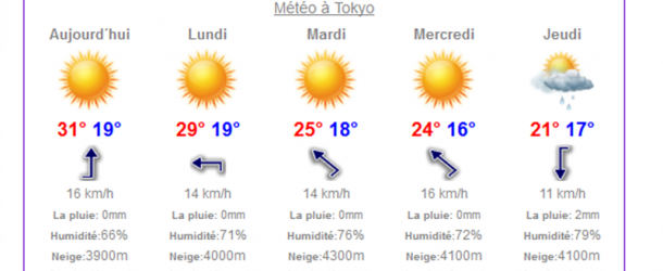 Maintenant que vous connaissez les tendances générales climatiques, pour les principales villes, au Japon, je vous propose d’accéder aux prévisions météos, gratuitement, pour les principales villes du Japon. Ceci est disponible ci-dessous, pour 5 jours, et vous permettra de gérer au mieux votre séjour une fois au pays du soleil levant.