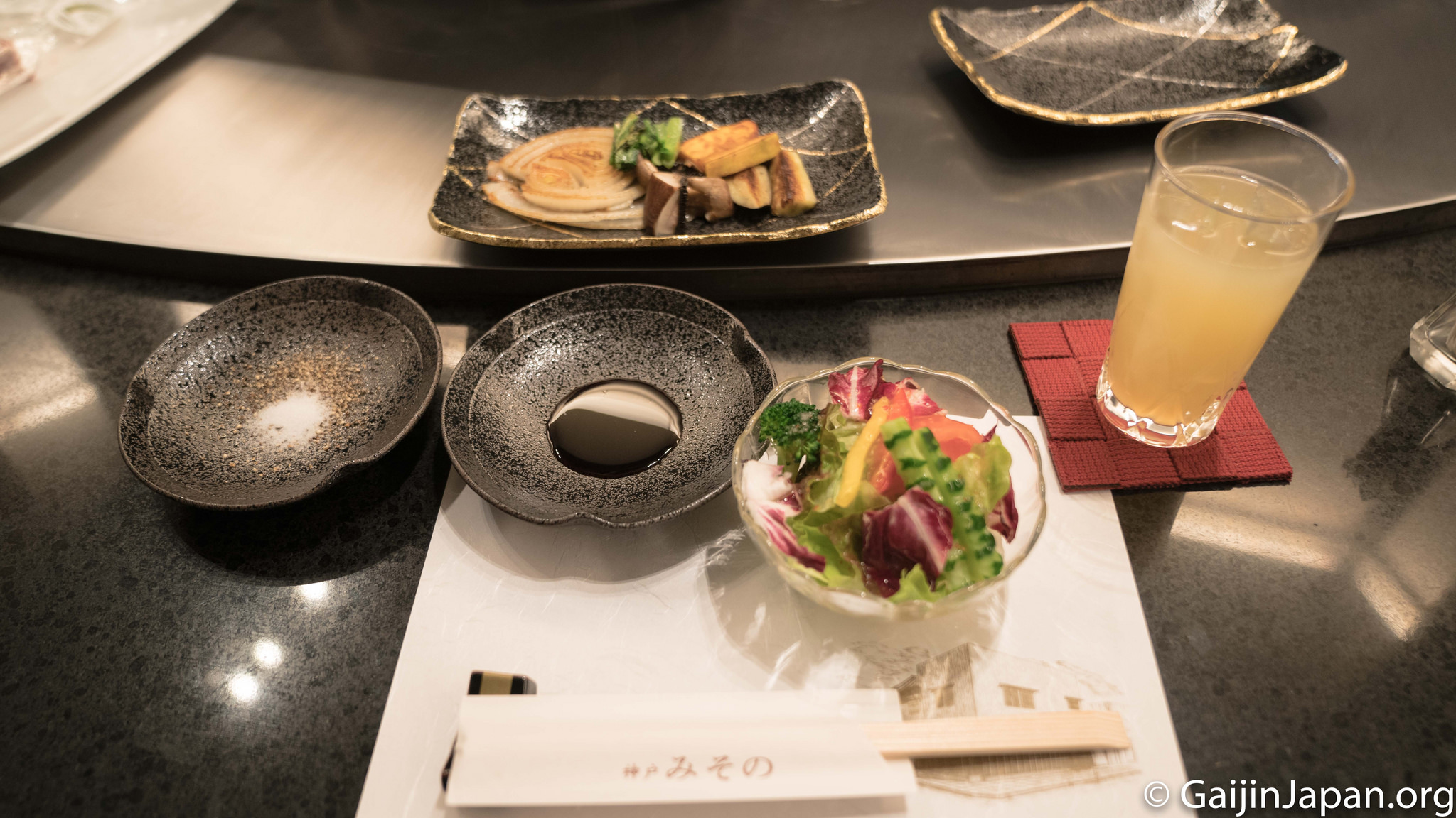 A peine l’ascenseur ouvert qu’on est accueilli, attablé, qu’on nous passe le tablier ciglé « Misono » et que le chef se lance dans la cuisson des mets devant nos yeux, après avoir commandé. Là, on peut observer et savourer du regard les aliments qui cuisent les uns après les autres, sur une plaque chauffante spéciale réservée exclusivement aux produits Halal (qui sont séparés des autres produits même dans la cuisine du restaurant). C’est ensuite un enchainement de saveurs qui commence avec la salade, puis les légumes grillés suivi du bœuf de Kobe avec son ail grillé et enfin le riz et le fruit en dessert.
