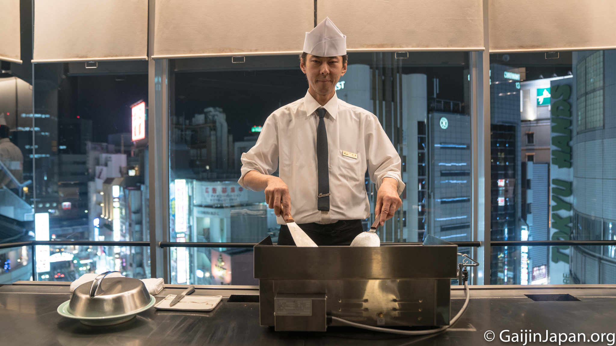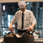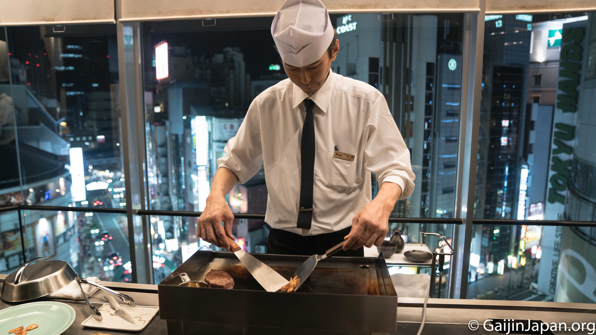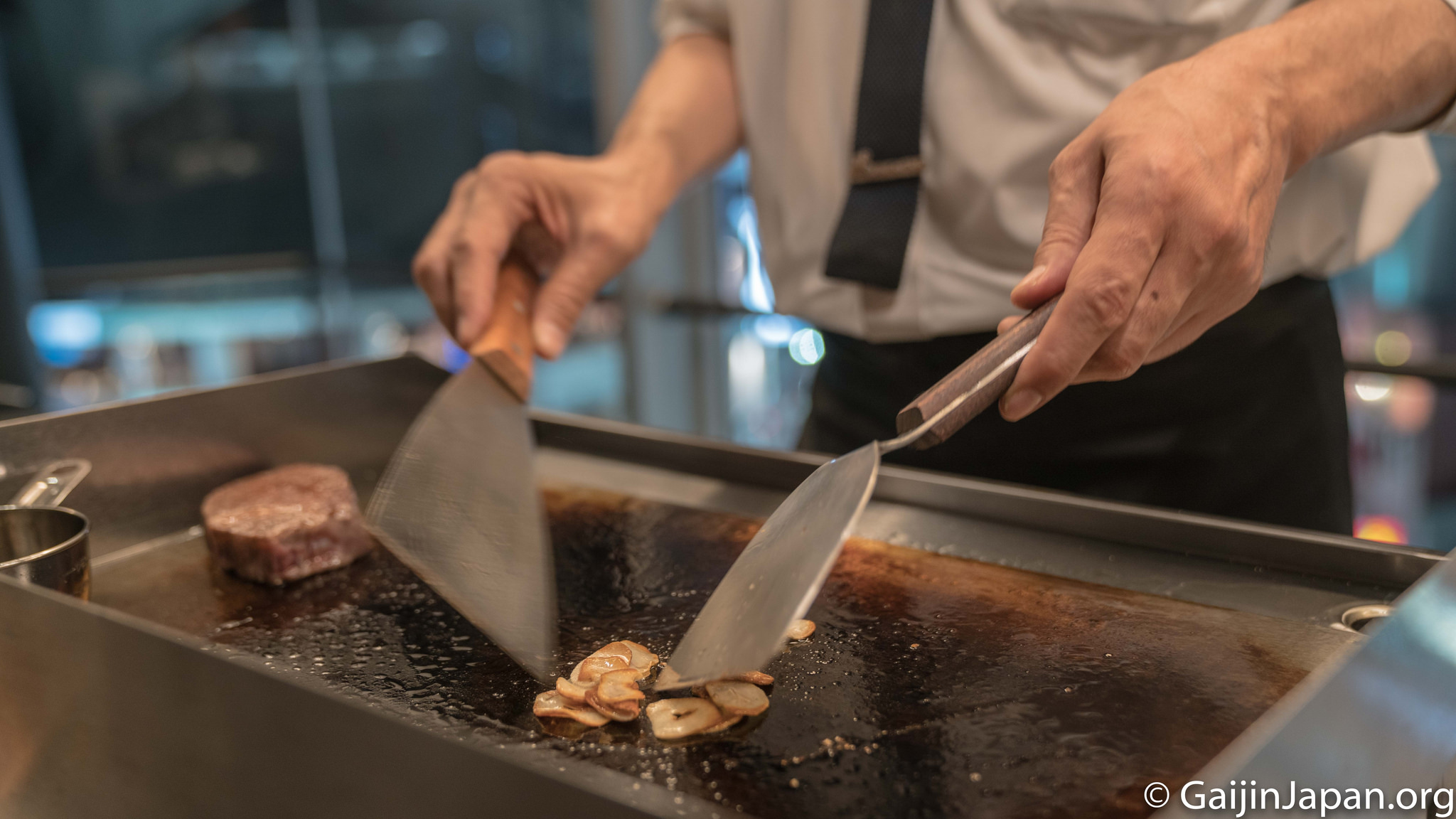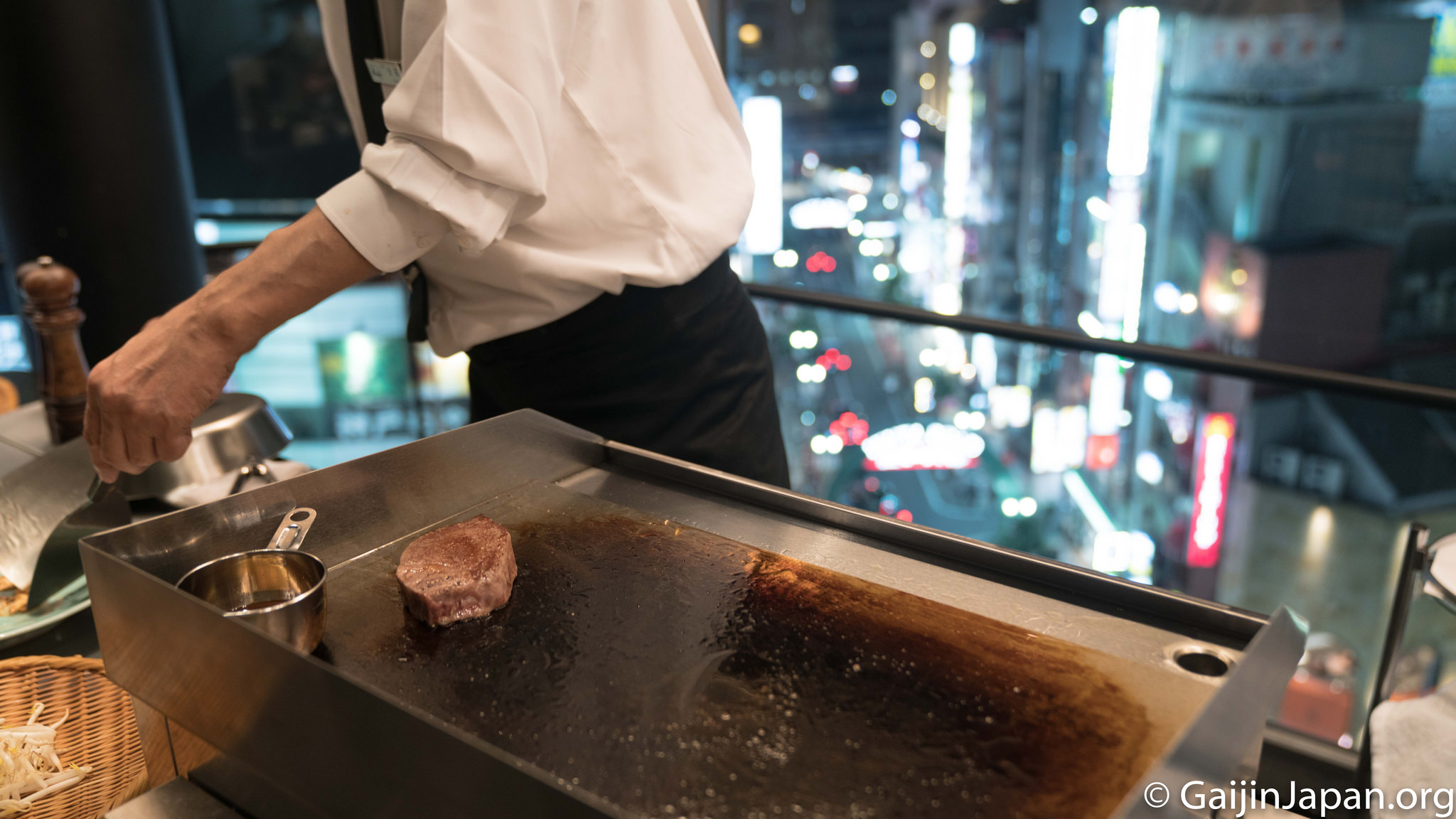 Je vous laisse imaginer : vous arrivez sur place, vous montez et vous êtes convié à vous asseoir à votre table, soit au 7ème, soit au 8ème étage. Devant vous une grande plaque de cuisson en forme de demi-lune et de l’autre côté de celle-ci se trouve un chef qui vous est dédié pour l’intégralité du repas. Derrière lui, une immense baie vitrée qui vous donne une pleine vue sur le quartier de Sannomiya, superbe notamment de nuit.