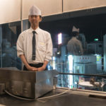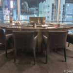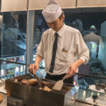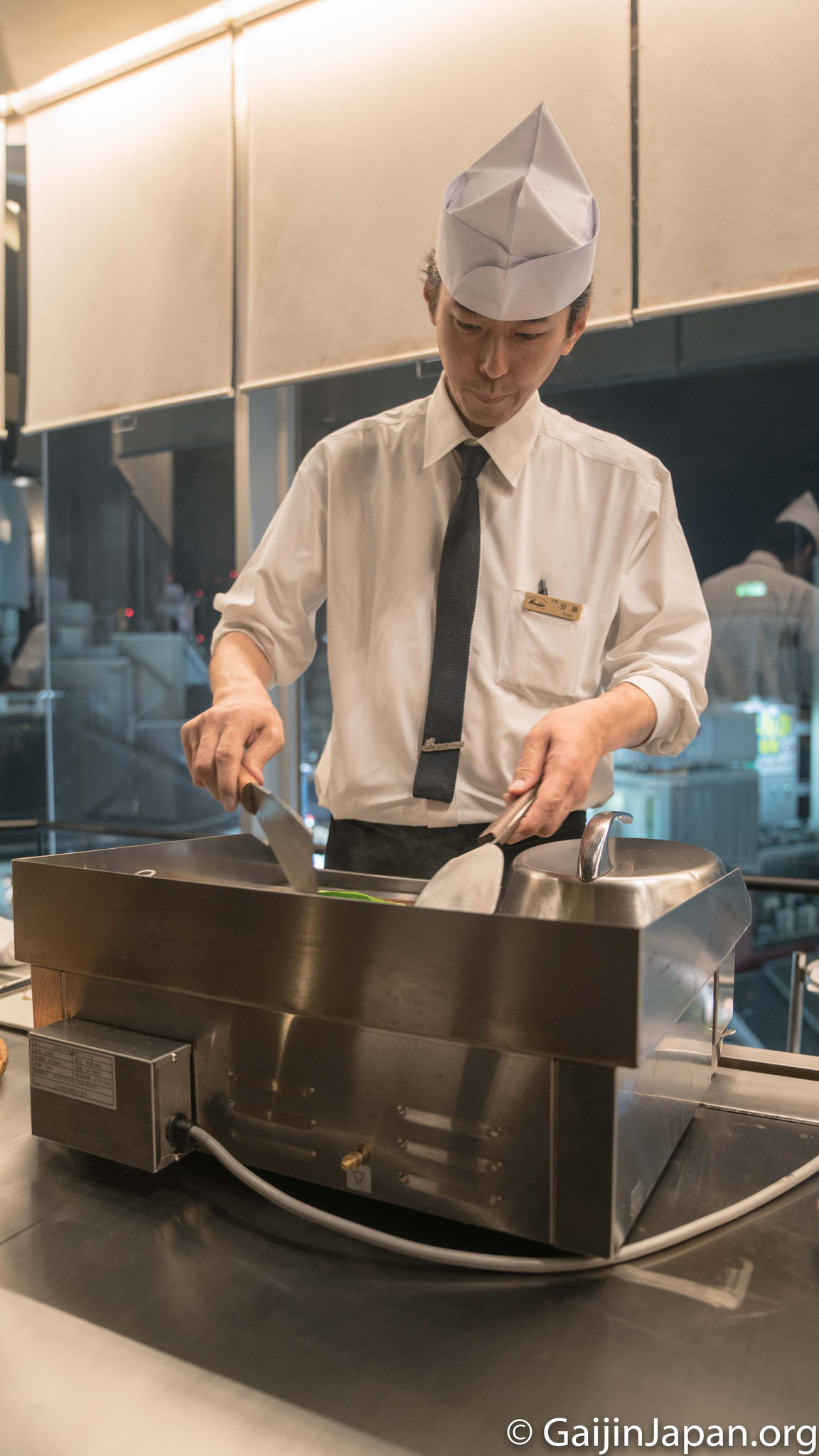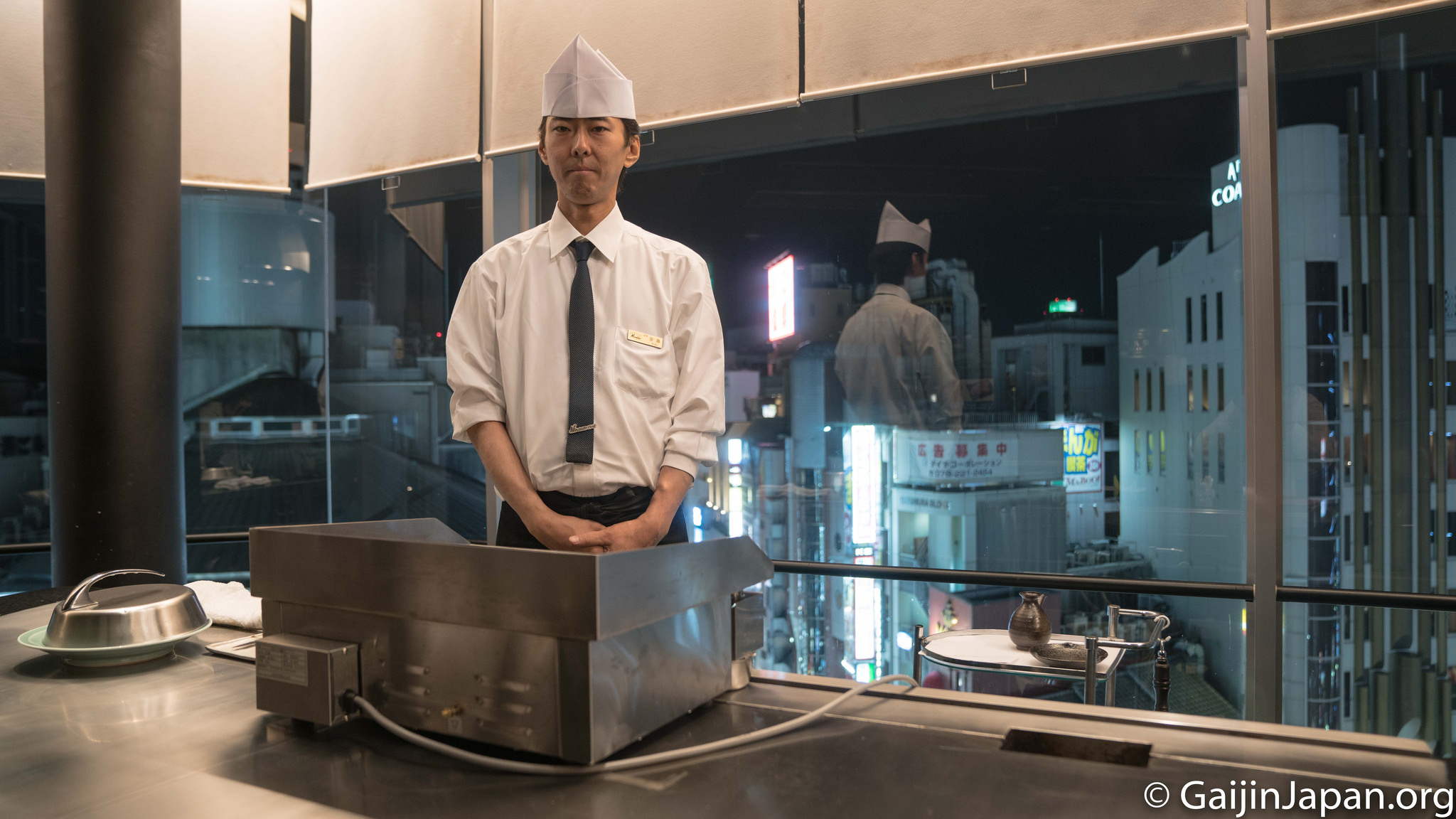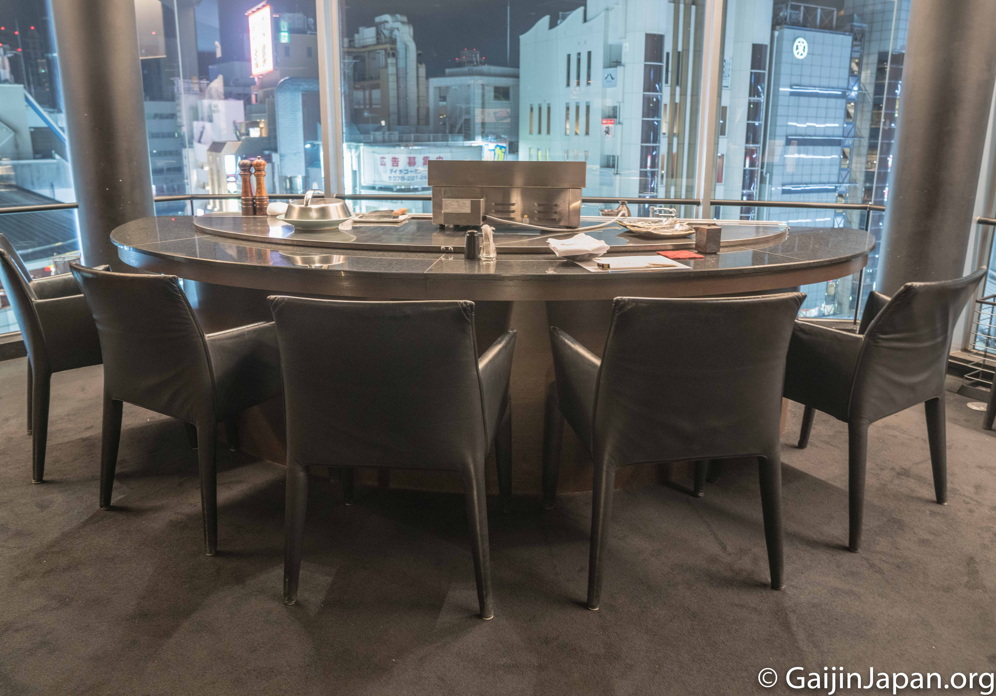 Je vous laisse imaginer : vous arrivez sur place, vous montez et vous êtes convié à vous asseoir à votre table, soit au 7ème, soit au 8ème étage. Devant vous une grande plaque de cuisson en forme de demi-lune et de l’autre côté de celle-ci se trouve un chef qui vous est dédié pour l’intégralité du repas. Derrière lui, une immense baie vitrée qui vous donne une pleine vue sur le quartier de Sannomiya, superbe notamment de nuit.