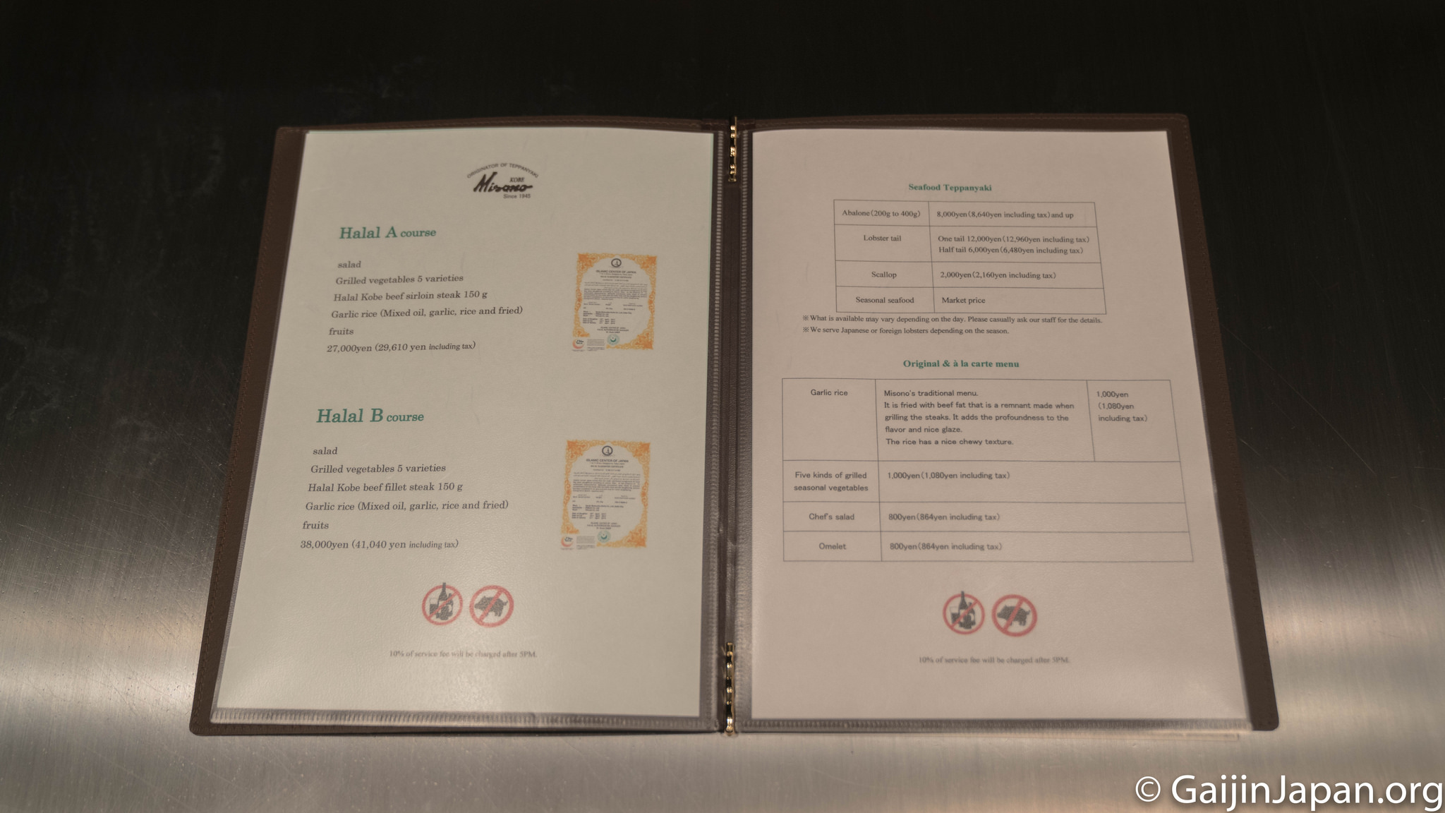 Jusqu’à récemment, toutefois, un grand nombre de personnes n’avaient pas nécessairement accès à cette expérience culinaire hors du commun, non pas à cause d’un tarif élevé pouvant être prohibitif, mais plutôt parce qu’il n’existait pas d’offre en rapport avec leurs croyances religieuses. Je parle là des musulmans, dont je fais partie. Mais, depuis quelques années, sous l’impulsion du gouvernement japonais, les choses changent et évoluent. Je vous en avais parlé précédemment en vous présentant le premier bœuf de Kobe Halal au monde, vendu par la boucherie Tatsuya. Eh bien, dorénavant, le célèbre restaurant Misono à Kobe propose des menus « bœuf de Kobe Halal », en plus de ses menus habituels, pour satisfaire une clientèle oh combien nombreuse.