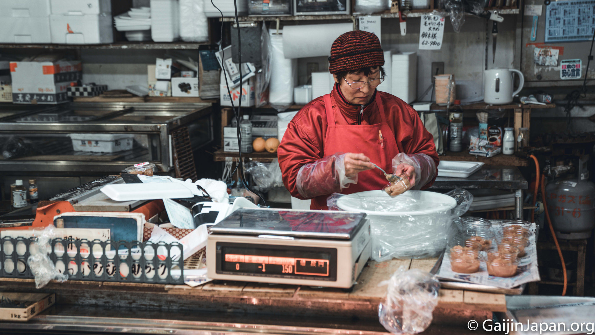 Comme pour beaucoup de marchés aux poissons au Japon l’ambiance y est chaleureuse. Il est facile d’échanger avec les vendeurs, qui n’hésitent pas à sourire et faire tester toutes sortes de produits aux quelques touristes passant par là.
