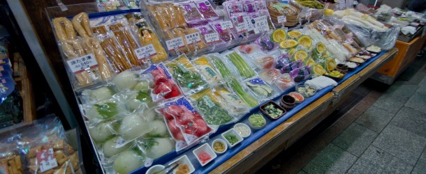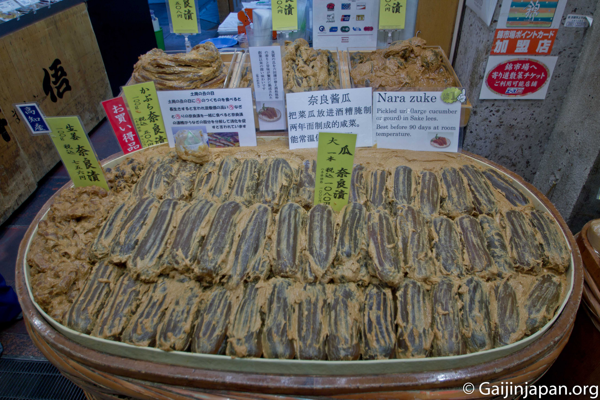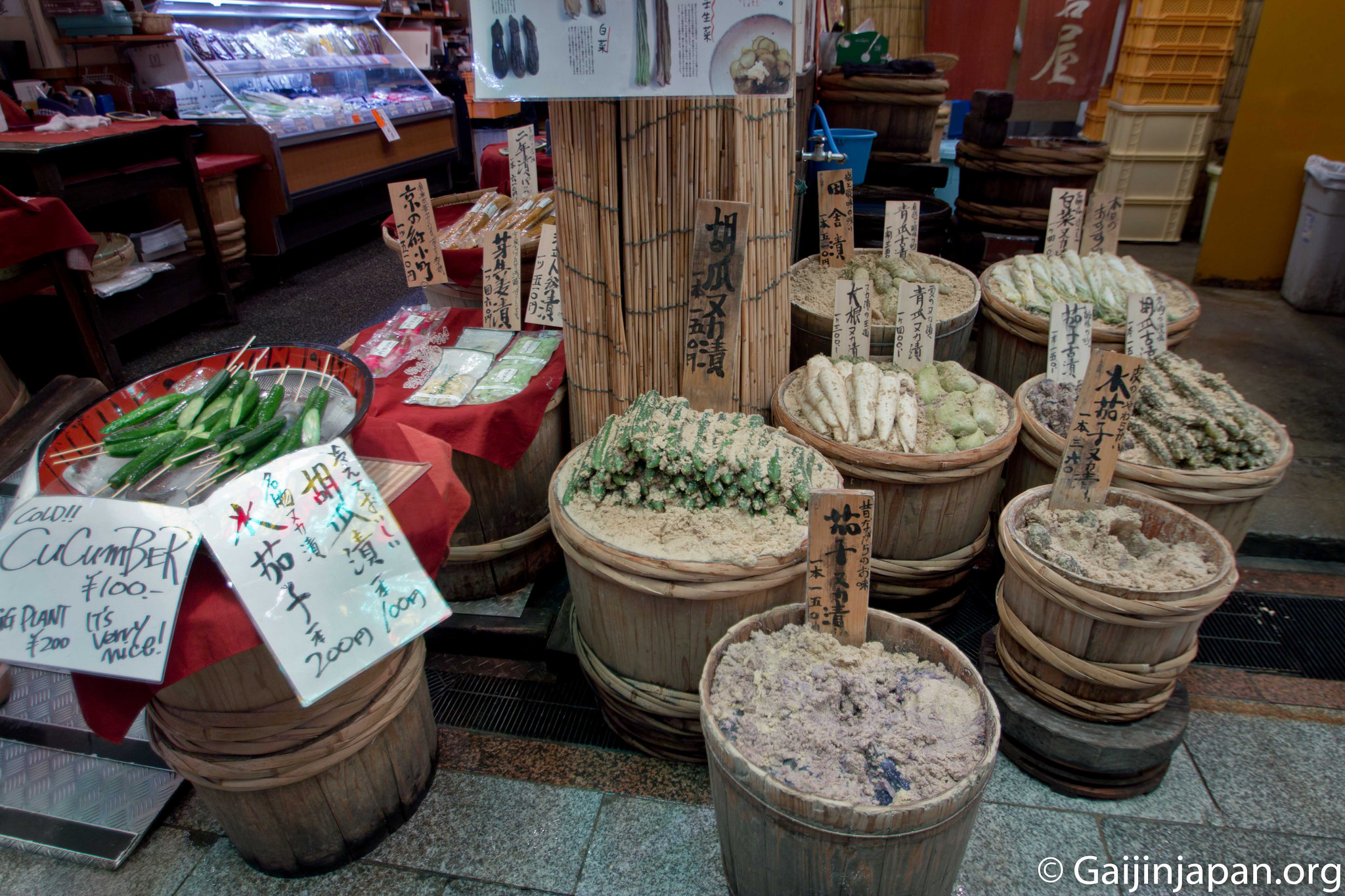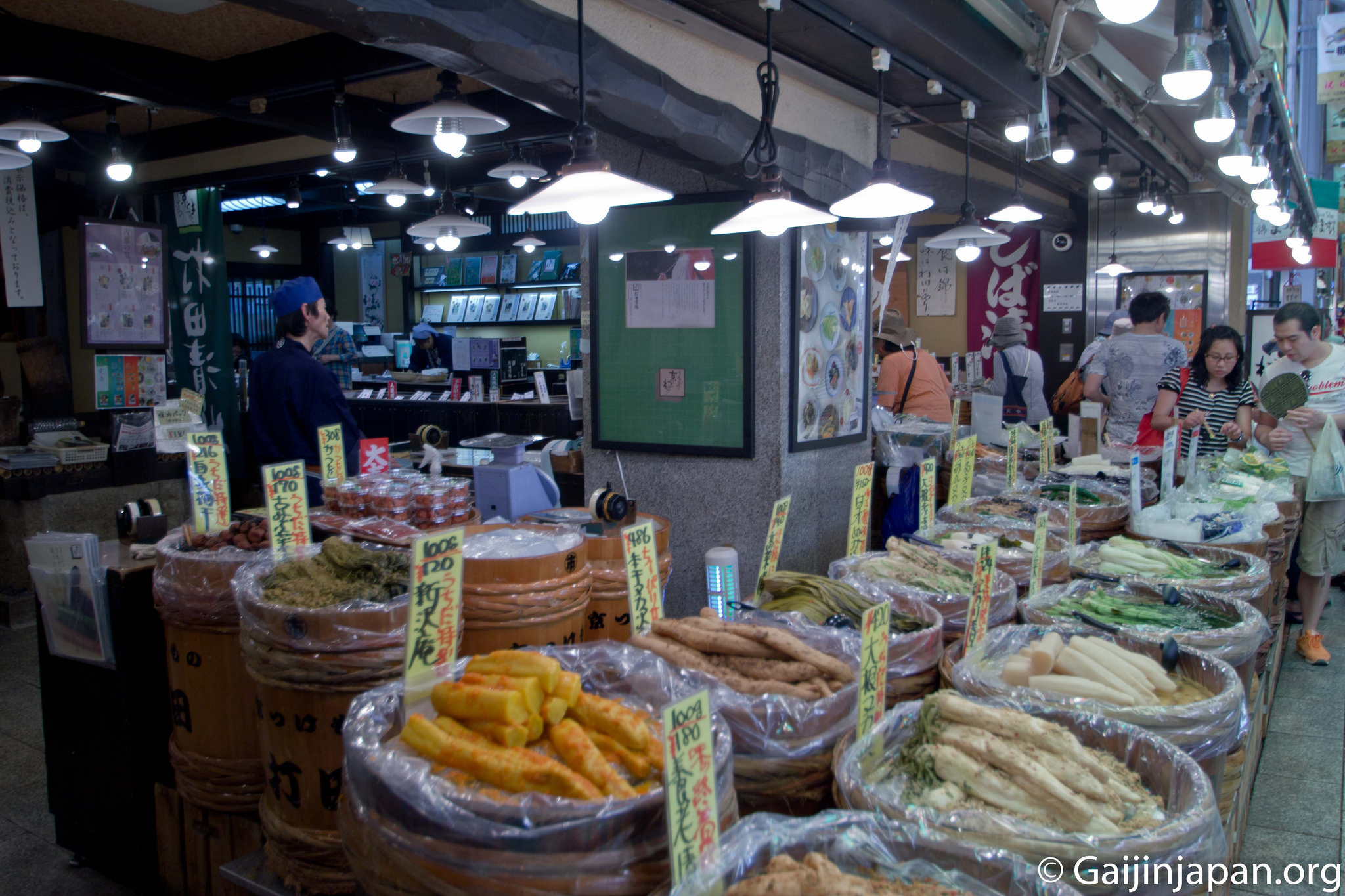 L’un des aspects que les touristes apprécient grandement dans ce marché, outre les couleurs, les saveurs, les odeurs et l’atmosphère générale du lieu, est le fait qu’il est possible, dans bon nombre de magasins, de tester gratuitement les produits mis en vente. Ainsi, tout en se baladant et en en prenant plein les yeux il est possible de se remplir la panse avec de succulents produits locaux, notamment les célèbres Tsukemono (légumes marinés).