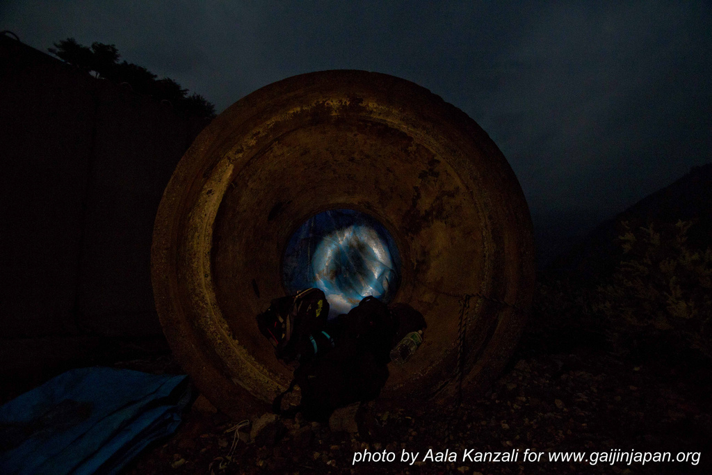 Une fois sur place, nous nous sommes rendu compte qu’il n’y avait aucun abri pour passer la nuit et aucun lieu où nous pourrions nous abriter en cas de pluie. Mais nous avons finis par trouver un gros tube en béton que nous avons aménagé pour la nuit. Ensuite nous avons fait un tour des lieux, pris quelques photos, mais le noir ambiant ne nous permettait pas de faire une bonne exploration. Nous avons donc décidé de nous reposer et d’attendre le matin.
