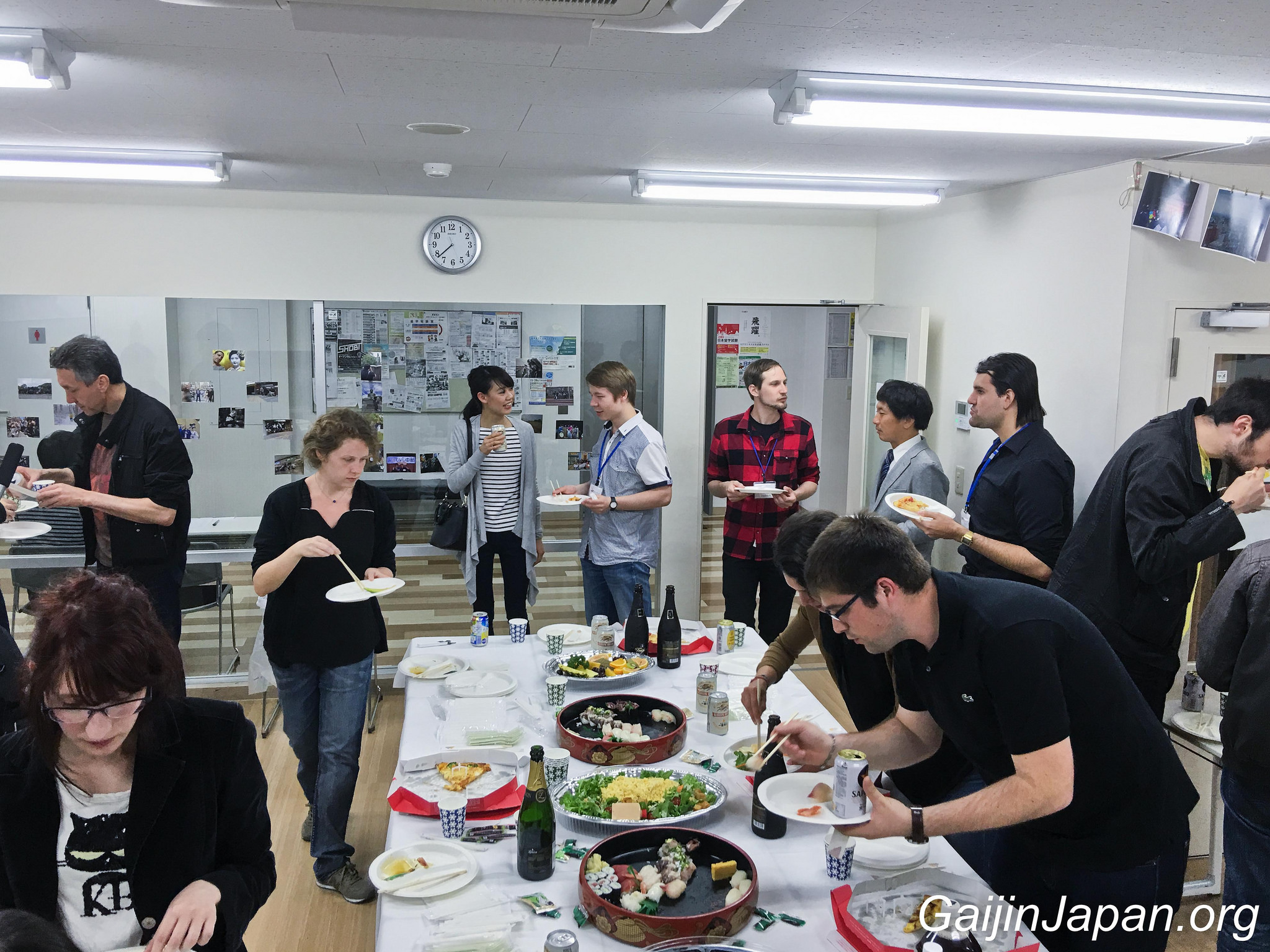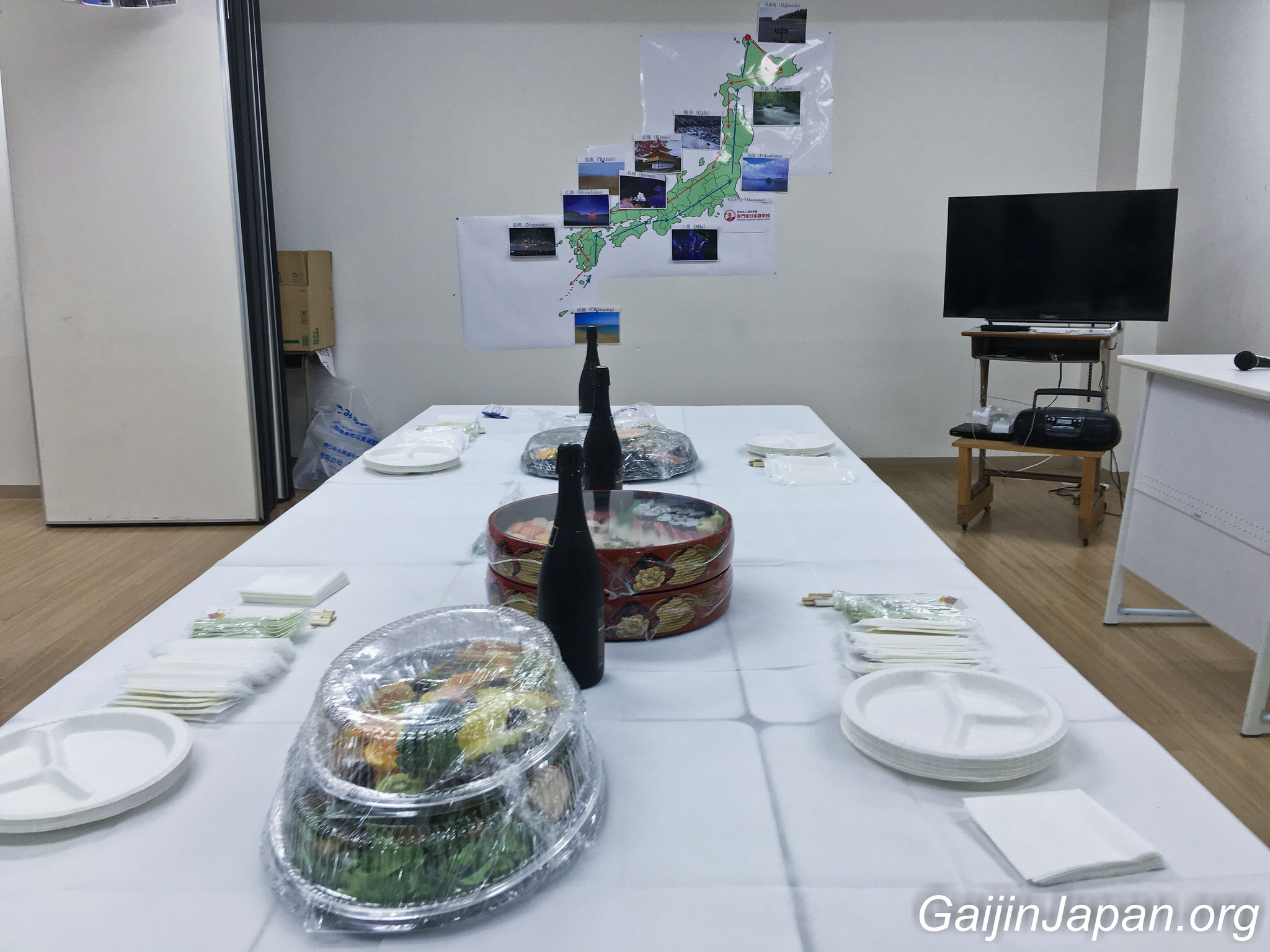 Mieux encore, deux salles de l’école avaient été arrangées afin d’accueillir tout ce beau monde, avec un buffet composé de pizza, sushi et autres snacks et accompagné de plusieurs bouteilles de champagne. Les murs des salles étaient décorés de mes photos ainsi que d’un grand plan représentant le circuit de ma marche ! Akamonkai avait mit les petits plats dans les grands et s’était donné beaucoup de mal pour me souhaiter un bon départ.