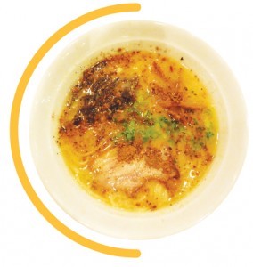 Tare: Tonkotsu / Garnitures: rôti de porc, échalotes, Nori, champignons, ail, chou, huile à base d’ail et de sésame.