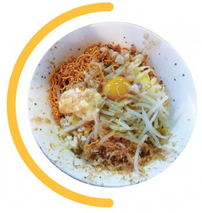 Tare: Tonkotsu – Shoyu / Garnitures: échalotes, pousses de bambous, poitrine de porc, œuf cru, germes de fèves