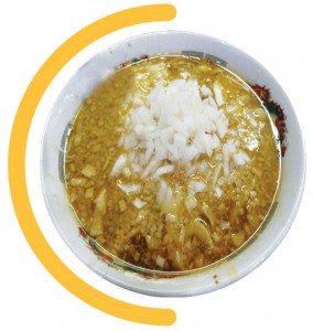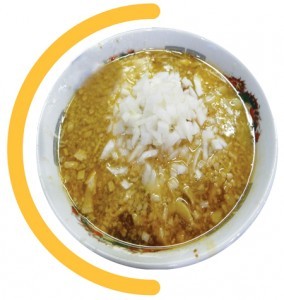 Tare: Shoyu / Garnitures: porc haché, échalotes, ciboulette chinoise, piments, ail.