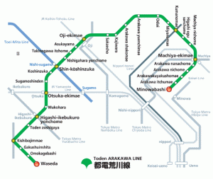 Il fût un temps où il y en avait plus, mais depuis, elles ont disparues. Par exemple, pour la compagnie Toden, il ne reste plus que la ligne Arakawa Line (Waseda à Minowabashi) qui dessert 30 stations sur 12 km environs. Il faut compter 160 yen environ pour l’emprunter. La conduite y est en manuelle, les annonces et la signalétique en japonais et en anglais. Vous pouvez utiliser votre carte Suica, mais pas votre JR Pass, en son sein. Voici le plan de la Toden Arakawa Line.