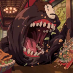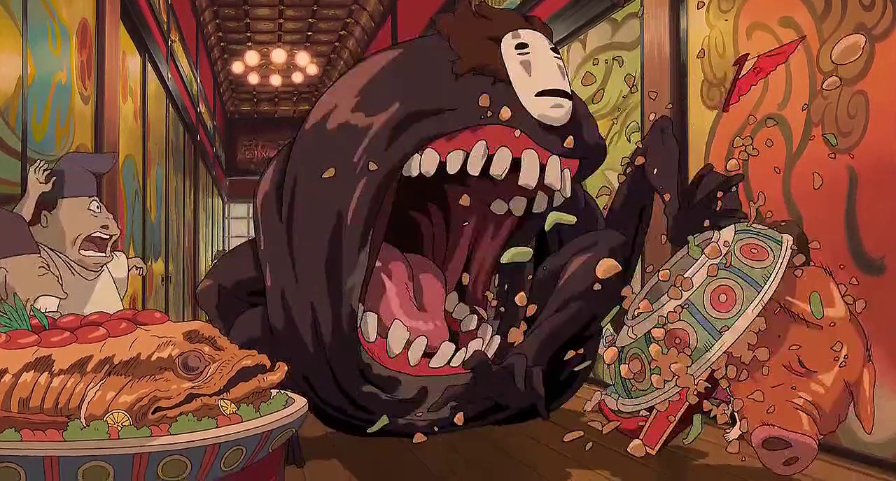 Enfin, Miyazaki continue de nous dévoiler des aspects de cette société avec le « Sans-visage ». Au début, il n’est pas accepté dans les bains de Yubaba. Cependant, une multitude de pépites d’or suffit pour que tout le monde se prosterne à ses pieds et le serve en espérant recevoir une part du butin. Par la suite, chaque personne ayant voulu profiter des largesses du Sans-visage se retrouve avalée par celui-ci, métaphore de la société de consommation qui nous aspire dans ces bas fonds.
