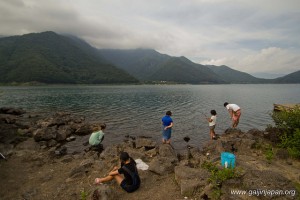 camping en bord de lac Saiko Mont Fuji – enfants pêchant