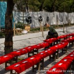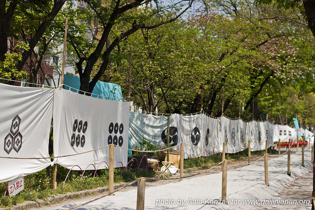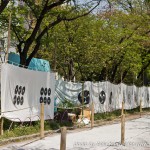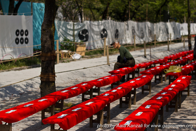 Donc, en ce samedi, je suis allé au Yabusame à Asakusa, au Sumida Park, qui longe le fleuve du même nom. Ce que je ne savais pas en arrivant là-bas, c’est que l’on pouvait réserver, à l’avance, des places pour s’asseoir sur des bancs et avoir une belle vue sur le spectacle. Et vu que je ne l’avais pas fait, j’avais des places en début de piste, un peu excentré par rapport aux cibles. Mais je voyais quand même bien et j’étais en bonne compagnie avec l’ami Charles, Pauline une lectrice de mon blog et ma femme.