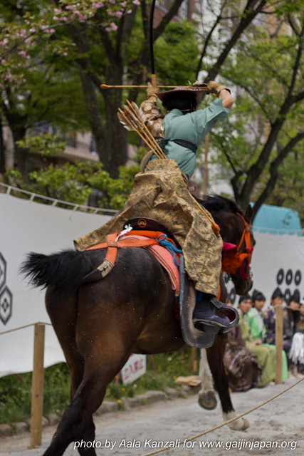 Les archers se lancent en début de piste, en selle sur leur monture, à toute vitesse et doivent tirer sur 3 cibles en bois, disposées le long de la piste en sable. Le cavalier se doit de guider son cheval avec ses genoux car ses bras sont occupés avec son arc. Lorsqu’il approche d’une cible, il charge son arc, le monte au niveau de son oreille et tire en criant « In-Yo-In-Yo » (obscurité et lumière). La grande difficulté réside dans le fait de pouvoir toucher les 3 cibles et les faire partir en éclat. En effet, entre chacune d’elles, l’archer à moins de 3 secondes pour recharger son arc et tirer, le tout sur un cheval lancé à pleine vitesse. Et cela est vraiment impressionnant à voir.