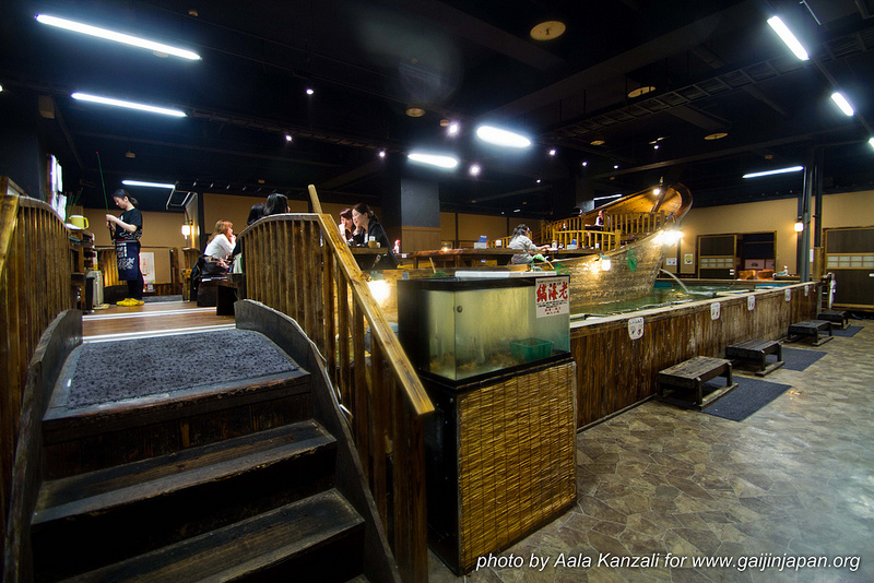 Après avoir marché quelques minutes depuis la station de Shinjuku, je suis entré dans cet Izakaya situé au premier étage d’un hôtel. Ici pas de petite salle où chacun se mets avec ces amis. Non, ici, se trouve un grand bateau entouré d’un bassin d’eau. Dans ce bassin, nagent des dizaines de poissons et coquillages.